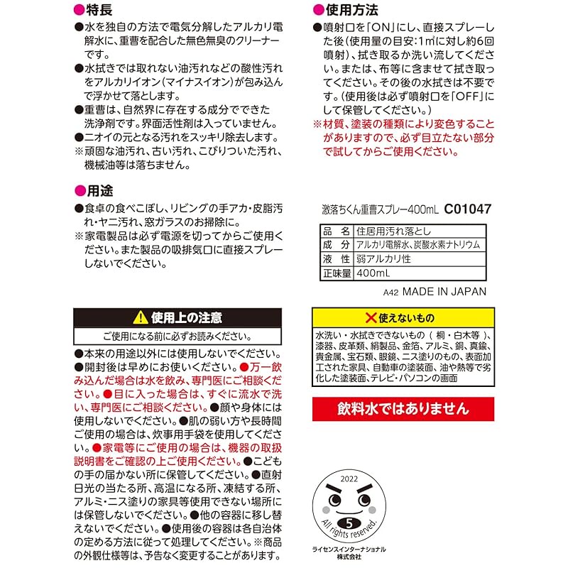 LEC [Gekiochi-kun] Baking Soda Spray, 400mL / Combination of baking soda and alkaline electrolyzed water / Removes sebum stains with the power of alkali