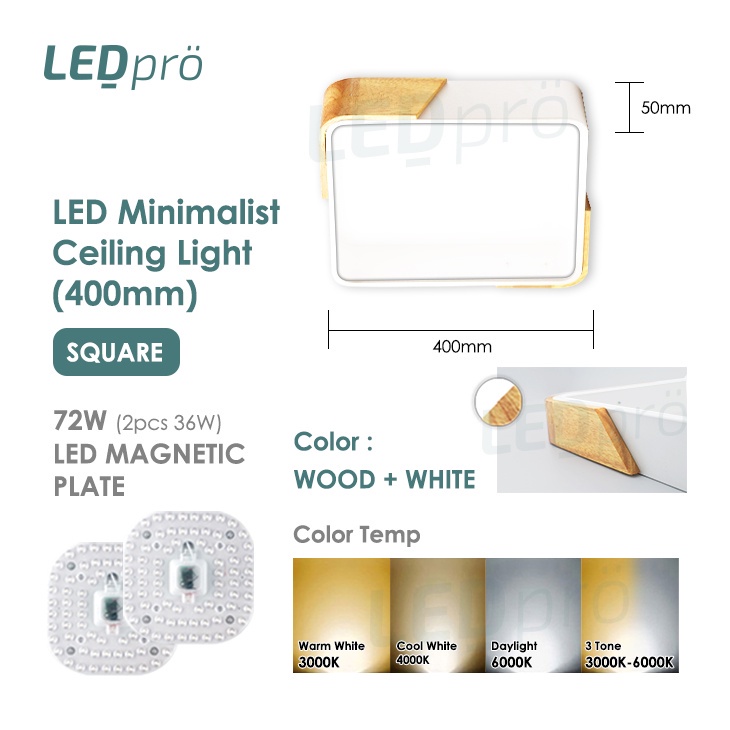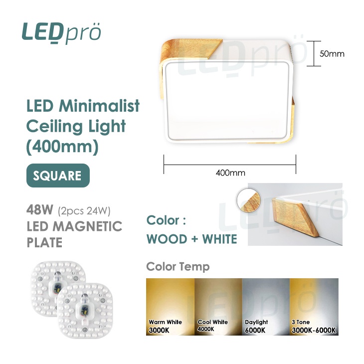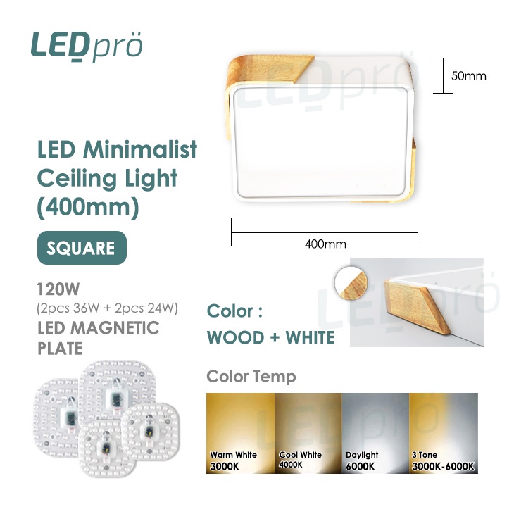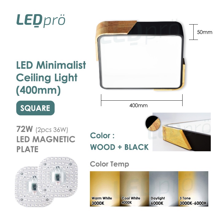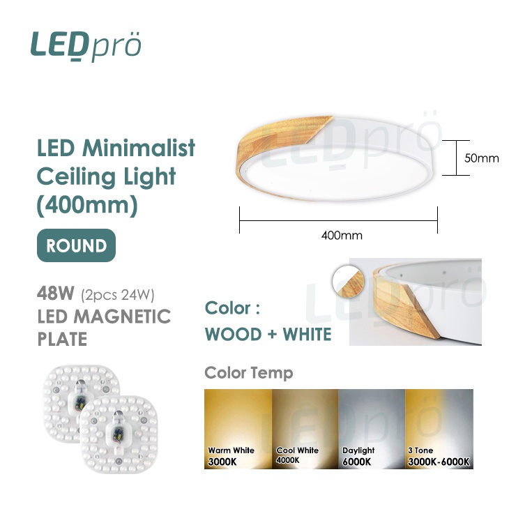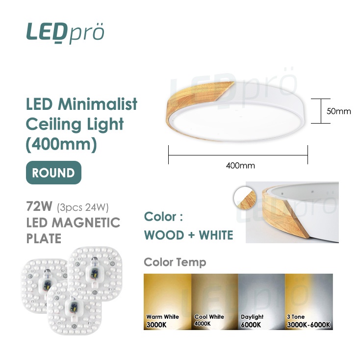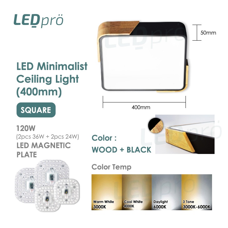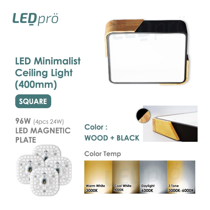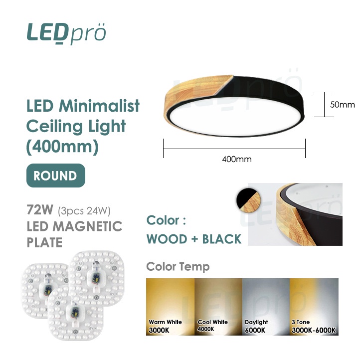 LED PRO Ceiling Lights 400MM 48W/72W/96W/120W Tri-tone Wood With Black/White Casing Modern Ceiling Nordic Bedroom Light