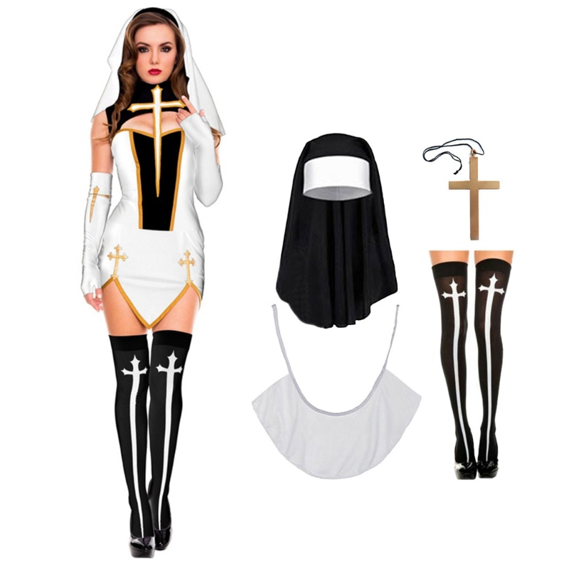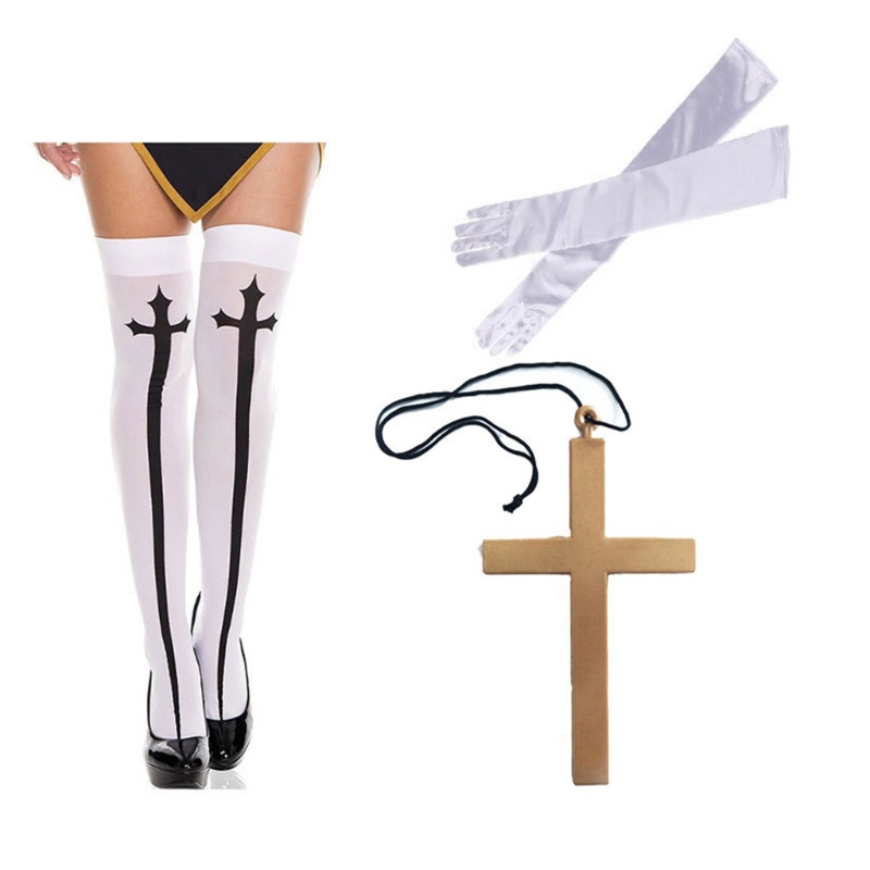 Nun Costume Set,Nun Hat,Cross Pendant Necklace,Knee Thigh Socks,Nun Collar