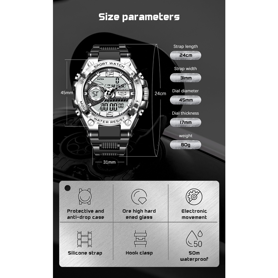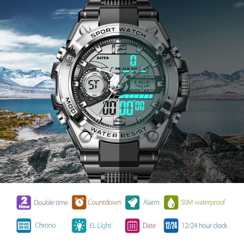 LIGE Digital Electronic Watch Men Full calendar Chronograph Watch Sports Waterproof Quartz Watches + Original Box