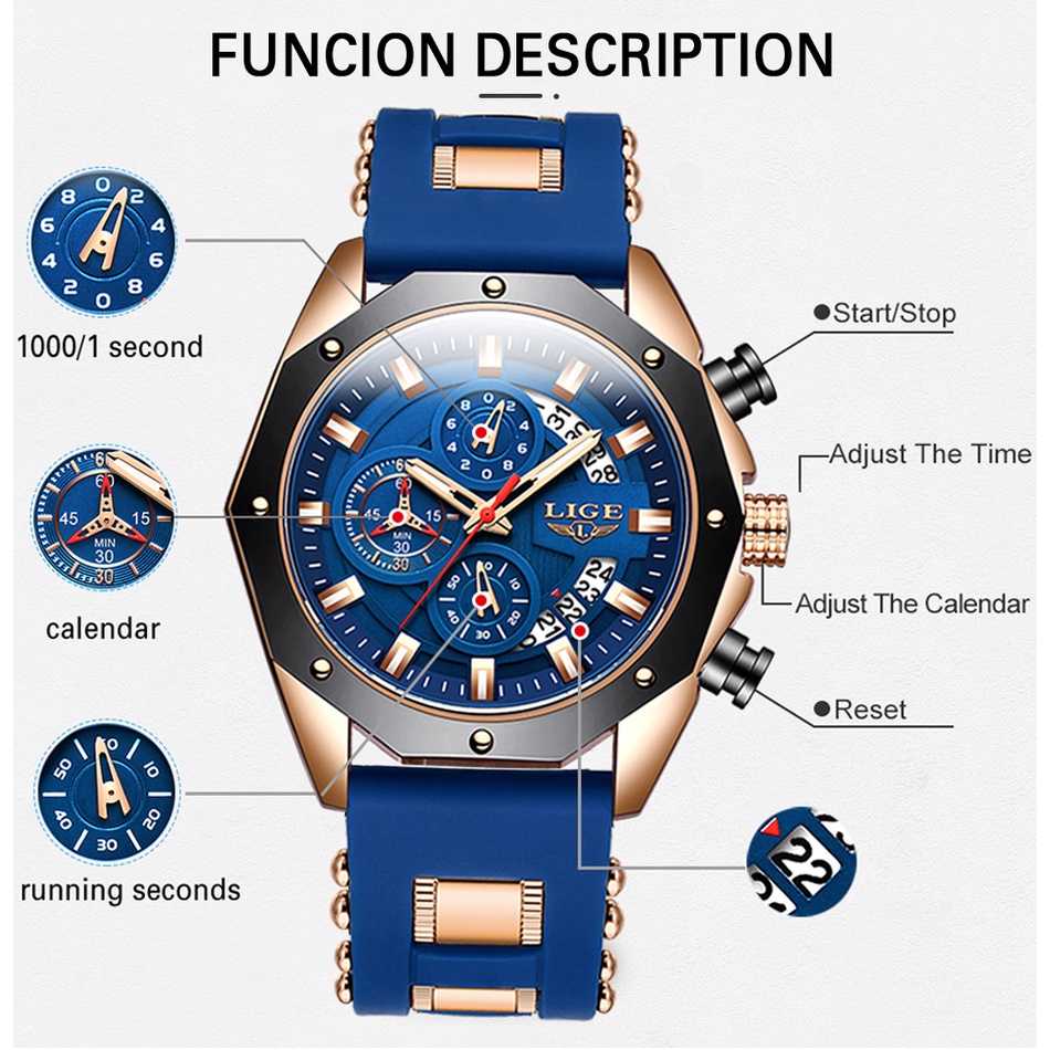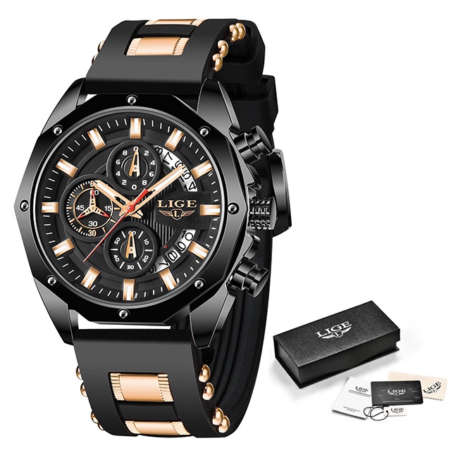 LIGE Watch Men Sports Luminous Chronograph Top Waterproof Silicone Strap Watches Quartz WristWatch