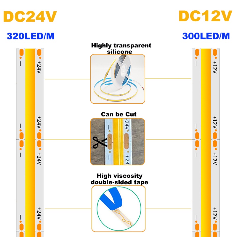LTG-GEE COB LED Light Strip 5M LED High Density Flexible FOB COB 8mm Width High Bright Led Tape Warm White Nature White Cool White DC12V DC24V