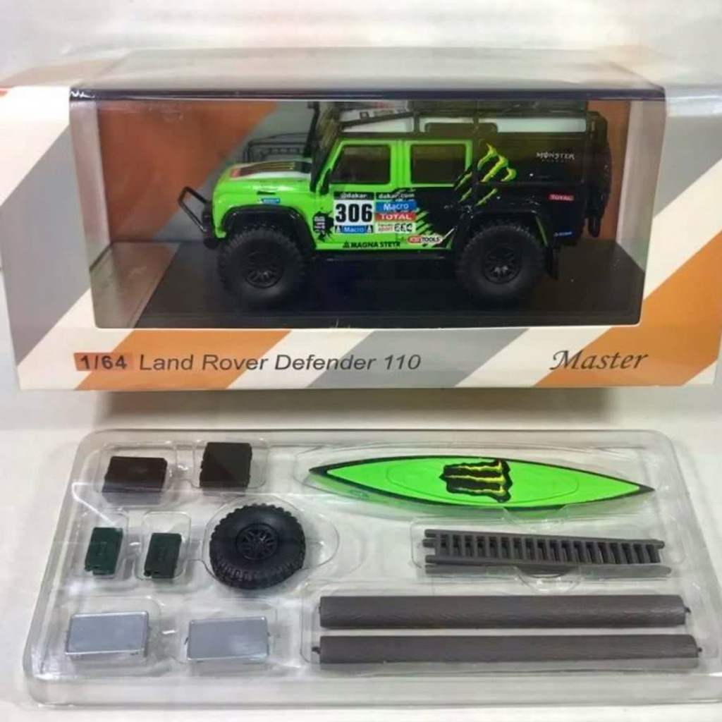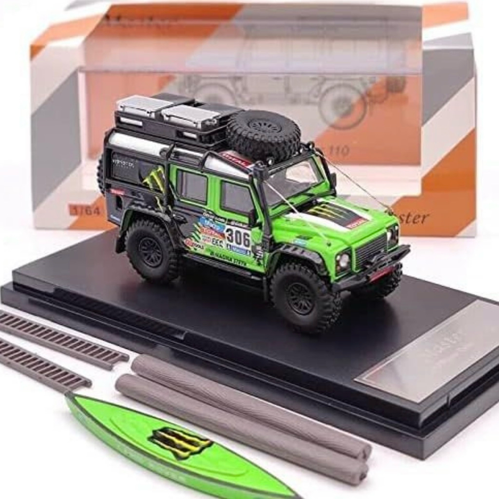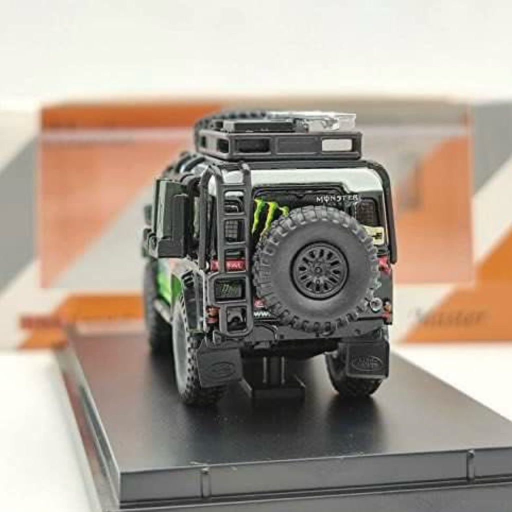 Land Rover Defender 110 Monster Energy Livery 1/64 custom diecast + accessories with display case