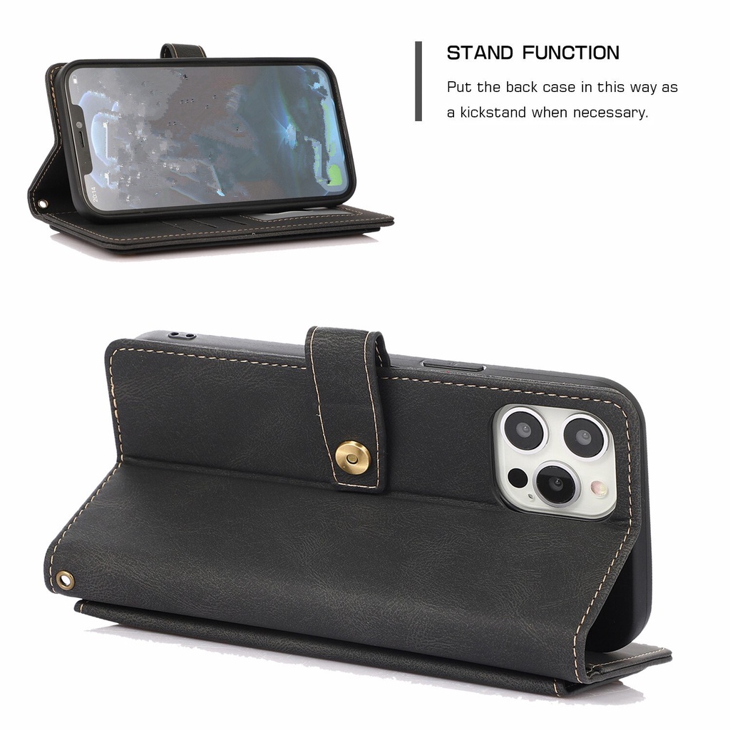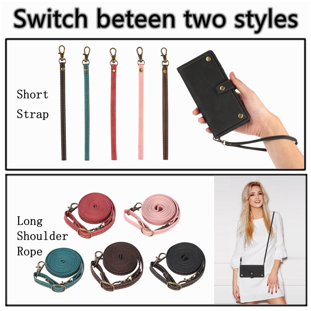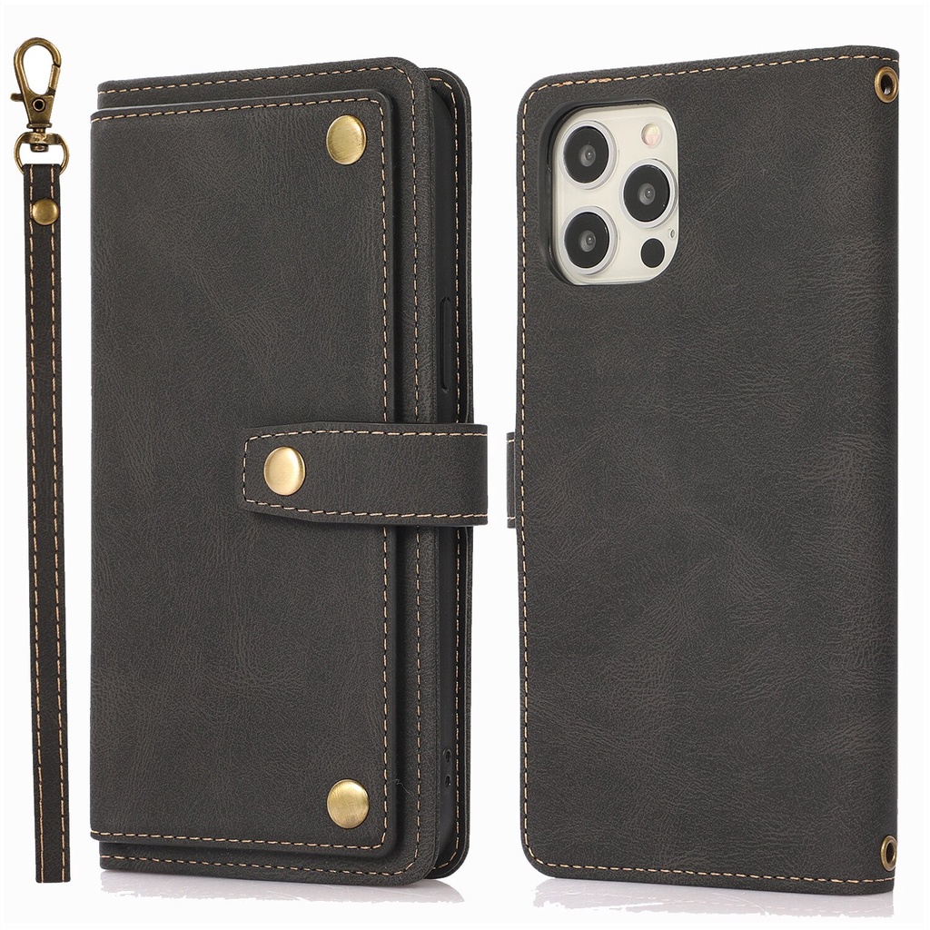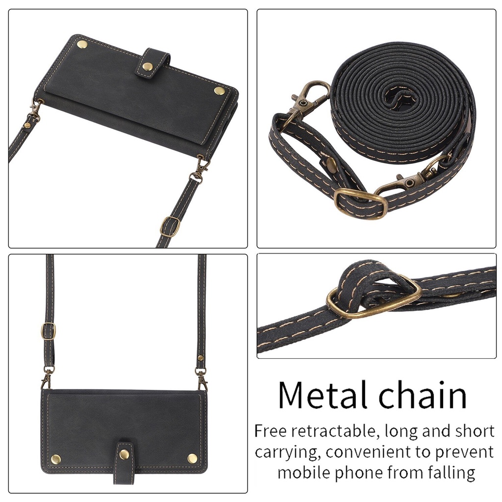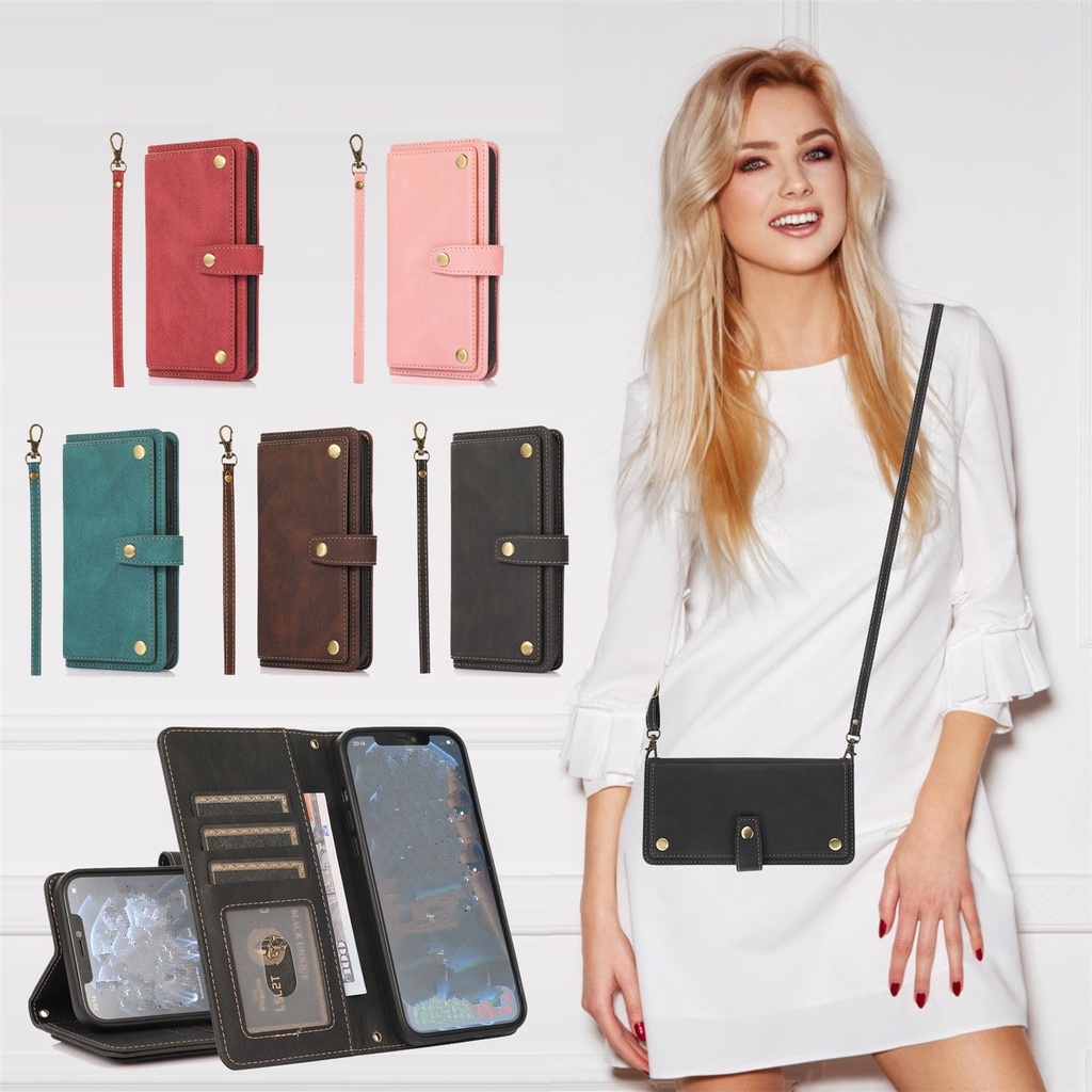 Leather Wallet Case for iPhone 13 Pro 14 15 16 Pro Max 12 Mini 11 XS Max XR X 6S 7 8 Plus SE 2020 Long Lanyard Strap Flip Stand Cover
