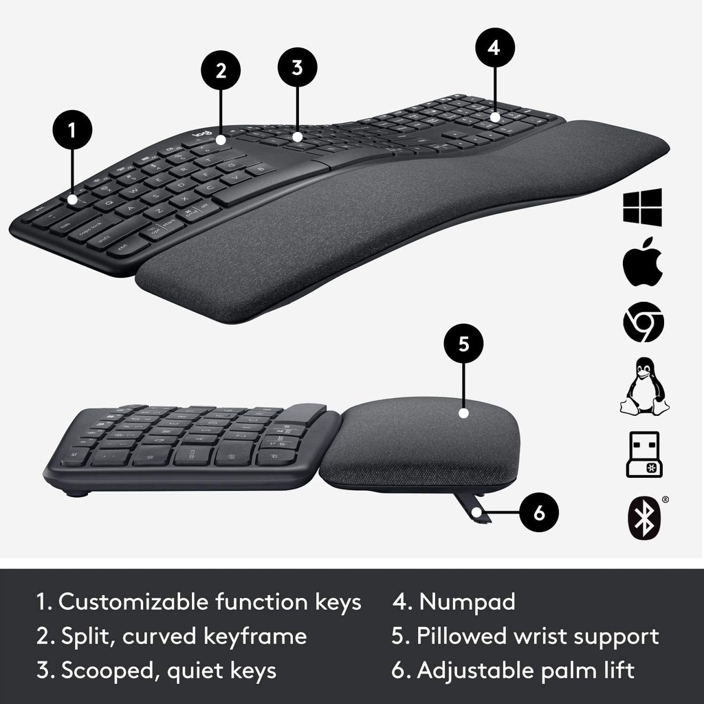 Logitech Ergo K860 Wireless Ergonomic Keyboard with Wrist Rest - Split Keyboard Layout for Windows/Mac, Bluetooth or USB