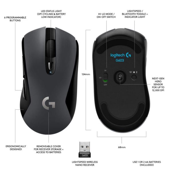 Logitech G603 Lightspeed Wireless / Bluetooth Gaming Mouse With Hero 12K Sensor