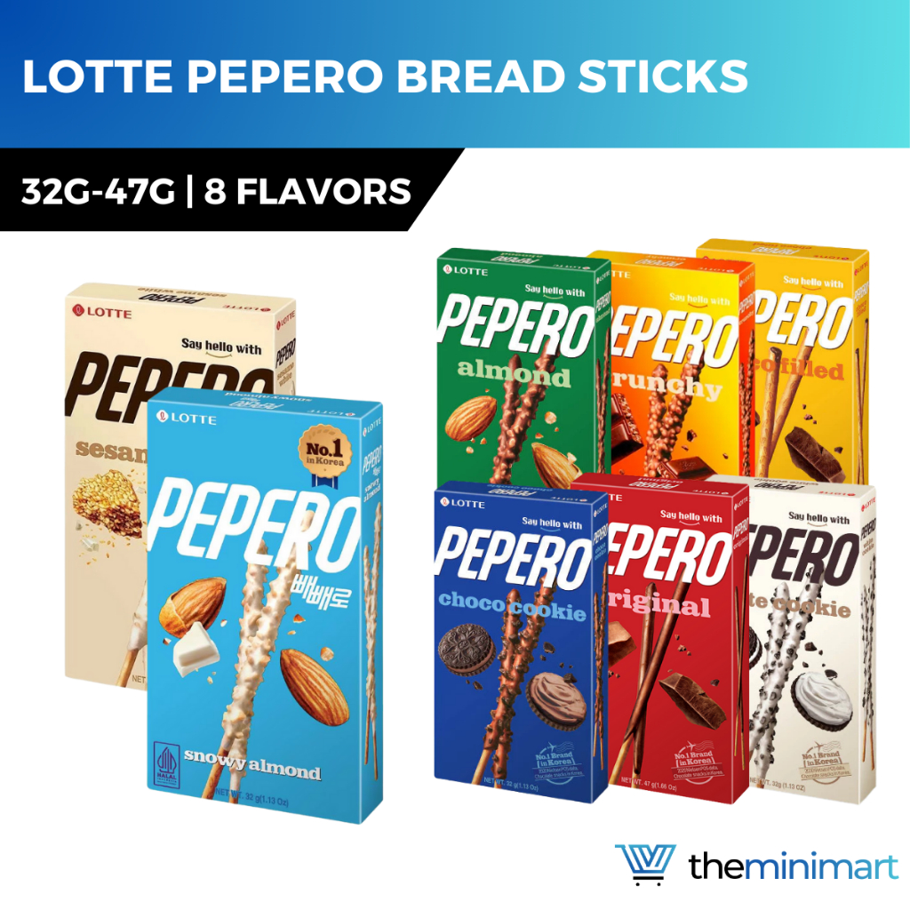 Lotte Pepero Bread Sticks - 32g-47g, White Choco, Sesame, Almond, Flavorful Crunchy Snacks