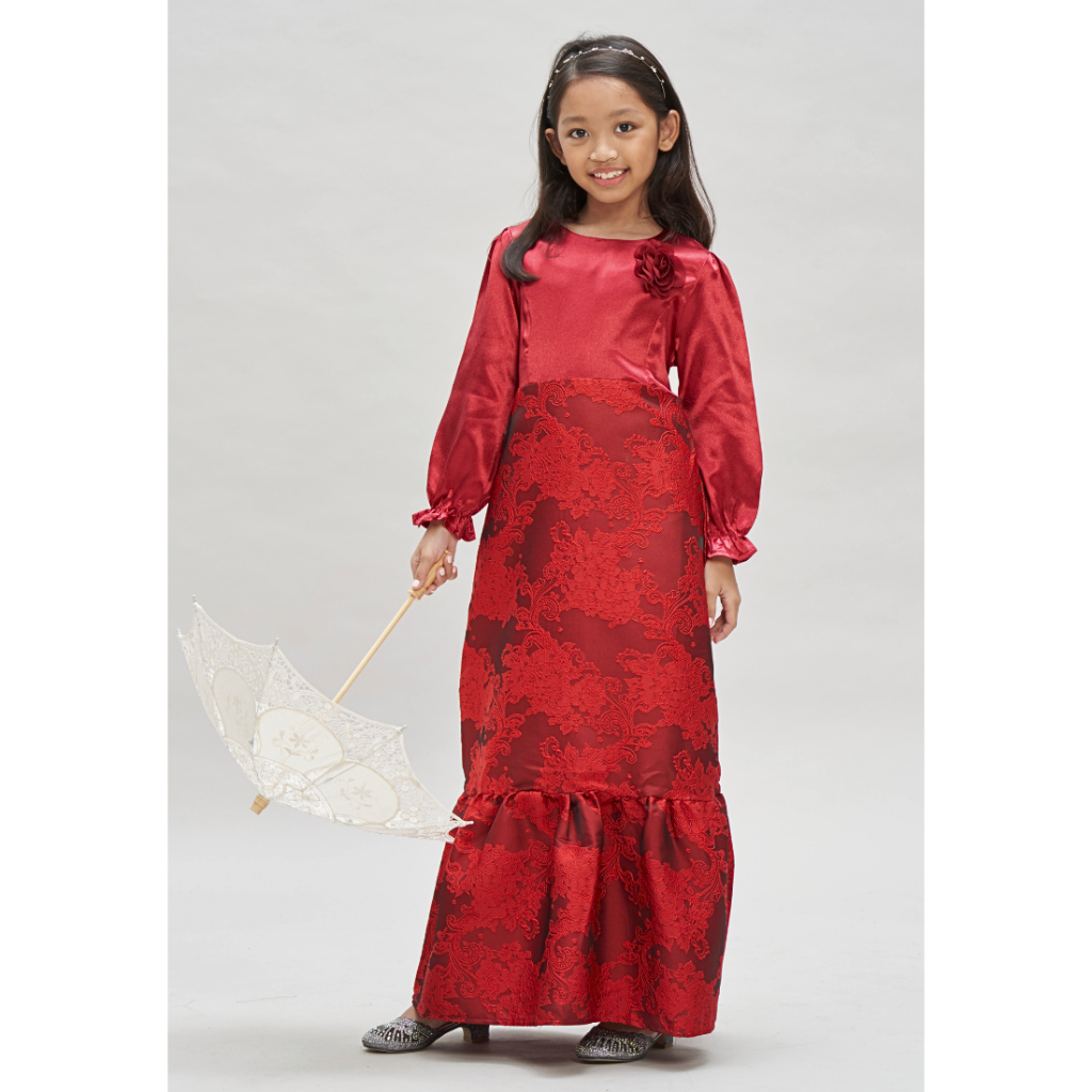 Loveaisyah Girl Maroon Red Jacquard Dress Baju Hari Raya