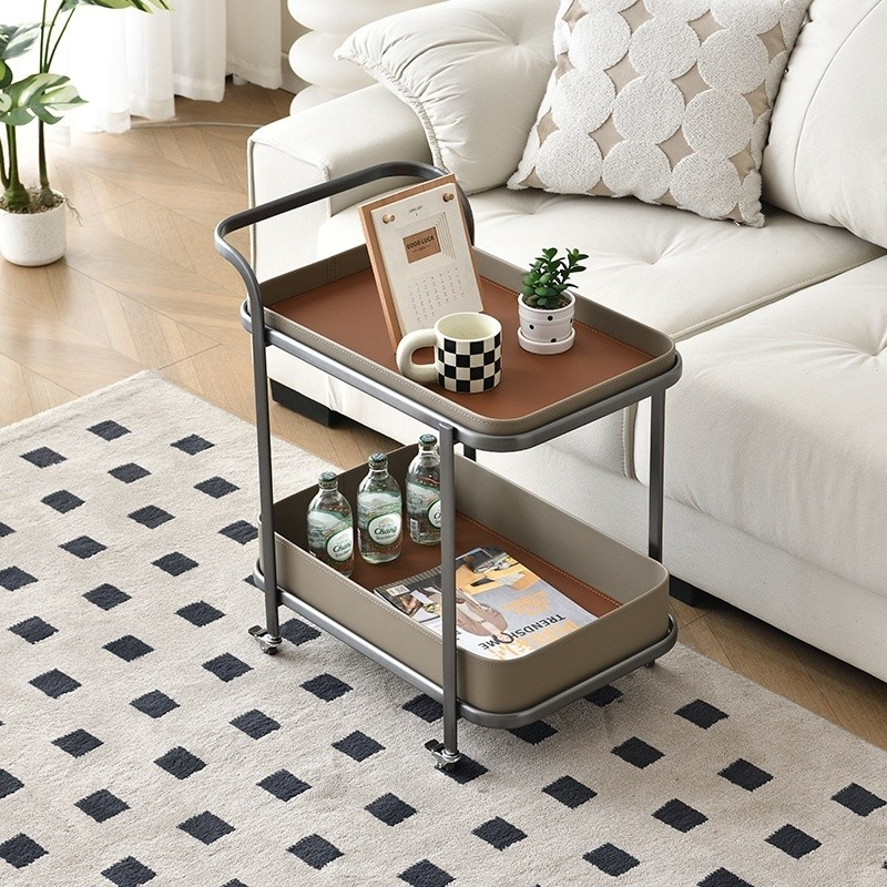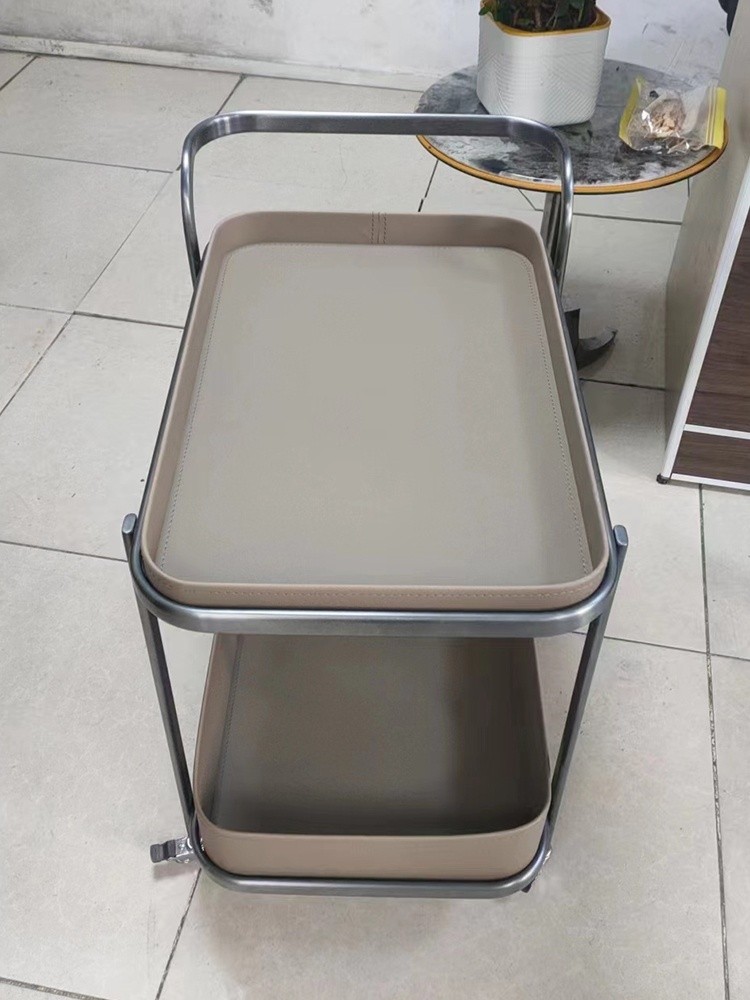 Luxury Trolley Cart Movable Saddle Leather Storage Trolley Side Table Living Room Stainless Steel Trolley
