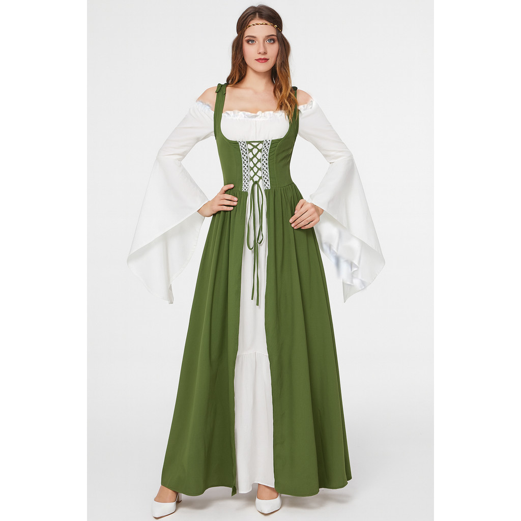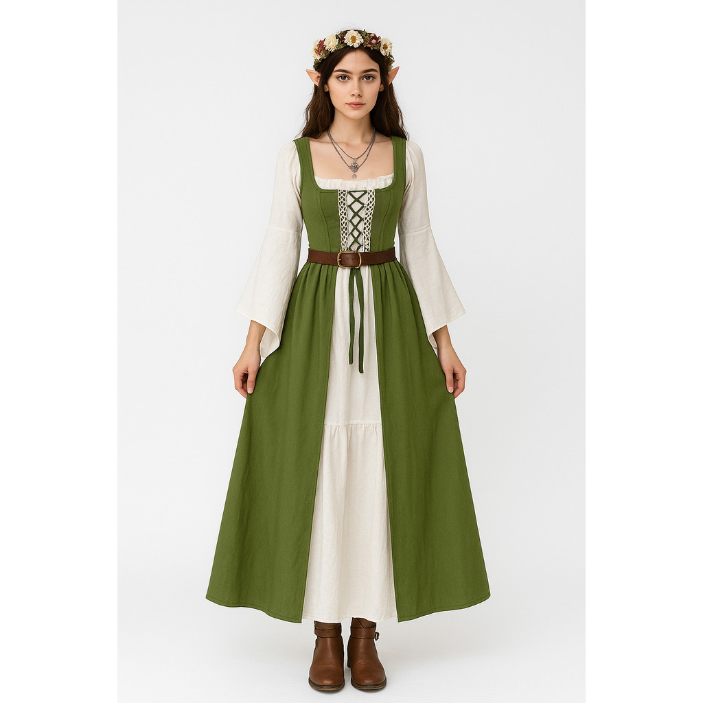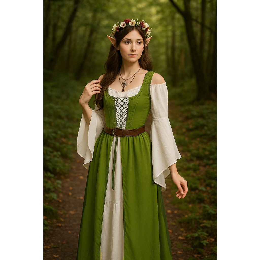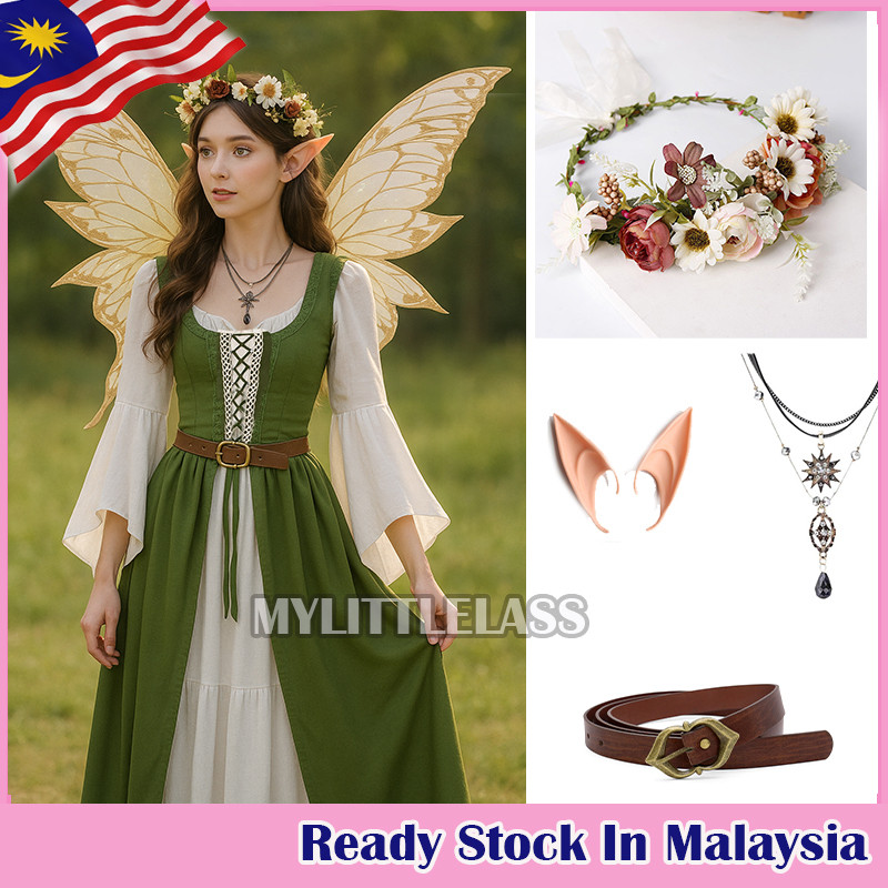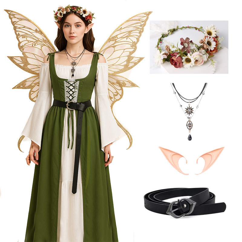 MYLITTLELASS Medieval Elf Fairy Costume Renaissance Dress with Wings, Floral Crown, Ears, Necklace & Belt Set