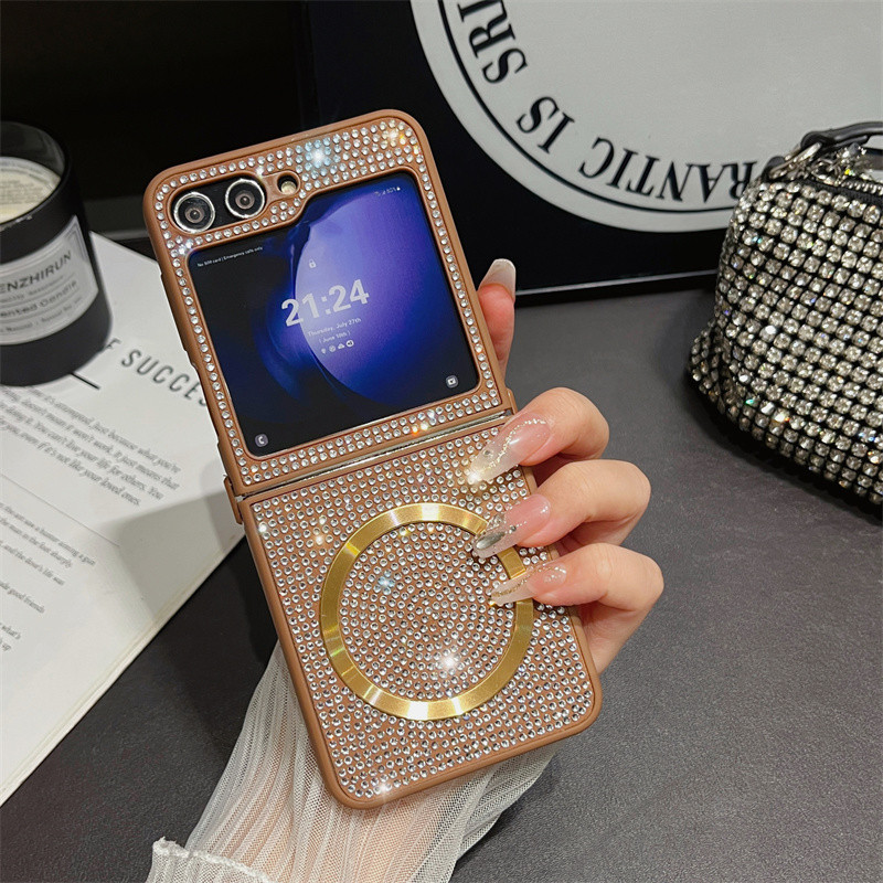 Magnetic Glitter Bling Phone Case Samsung Galaxy Z Flip 6 Z Flip 5 Z Flip 4 Z Flip 3 Casing with Crystal Bracelet Wrist Chain Wireless Charging Shockproof Cover Flip6 Flip5