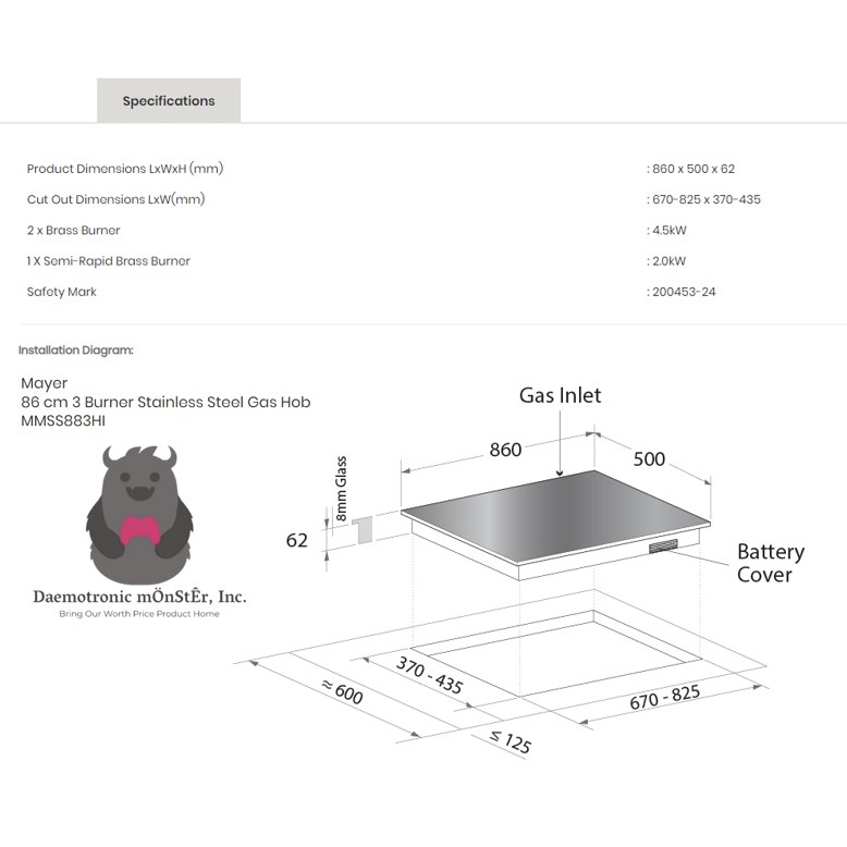 Mayer 86cm 3 Burner Gas Hob + M Series 90 cm Semi Integrated Cooker Hood Cooking Package (MMSS883HI + MMSI401)
