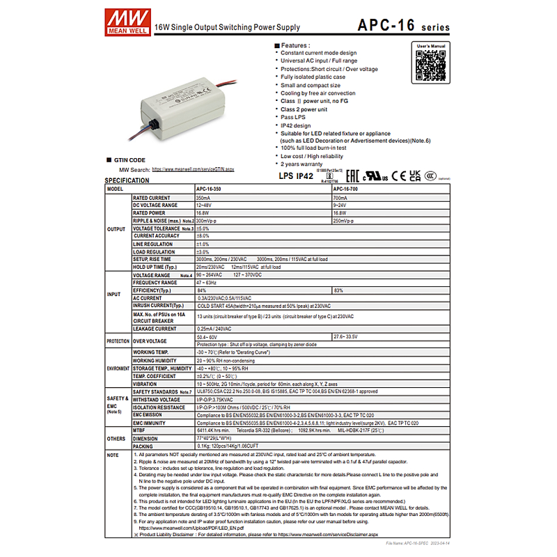 MeanWell APC Power Supply 16.8W 9V-24V 700mA(0.7A)Constant Current LED Driver for Light/Lamp [Mean Well: APC-16-700]