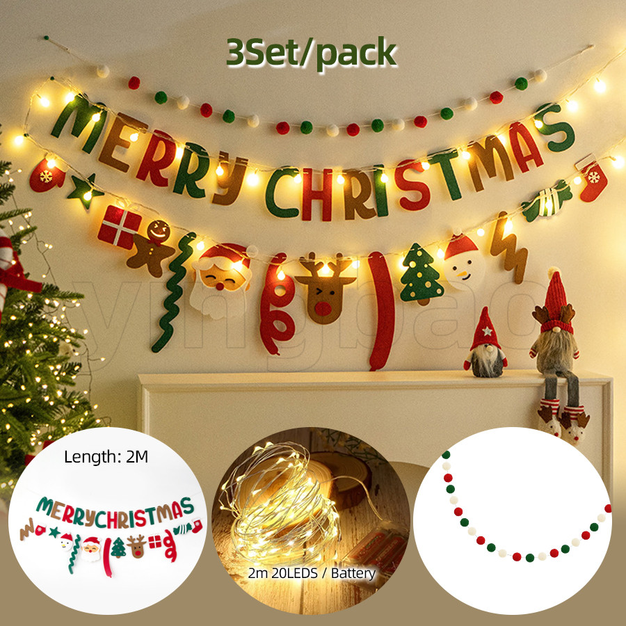 Merry Christmas Felt Pom Garland Banner with LED Lights Merry Christmas Sign Christmas Party Decorations Xmas Holiday Decor for Indoor Home Office Fireplace Mantle Farmhouse