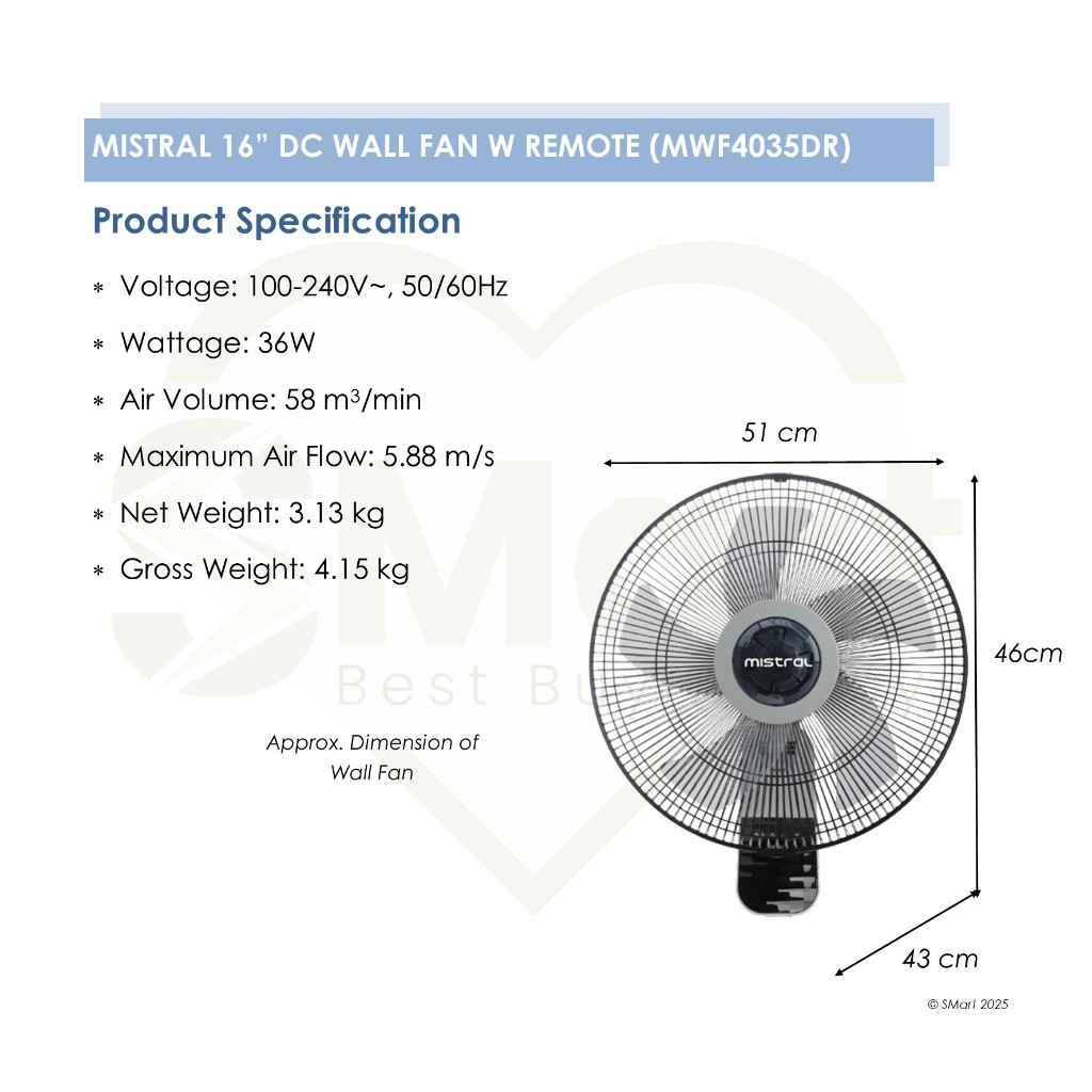 Mistral 16" Wall Fan with Remote Control & DC Motor [MWF4035DR]