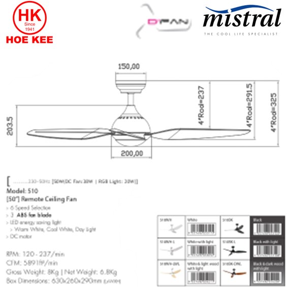 Mistral D'Fan 510-L 50 inch Ceiling Fan with Remote Control (LED Light)