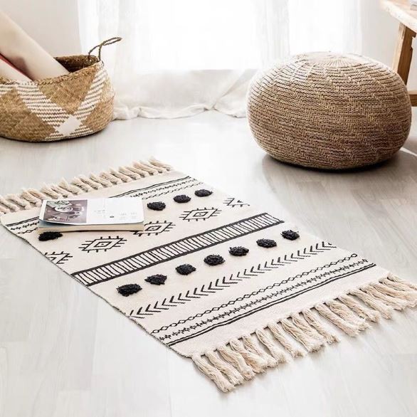Modern Scandinavian Motif Cotton Chenille Woven Tassel Floor Rug Living Room Coffee Table Door Mat