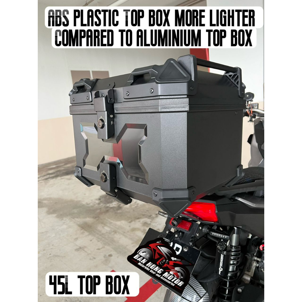 Motorcycle Top Box 45L ABS Plastic 'X' Design TopBox with Double Lock Full Black Plain Design Rear Storage Box