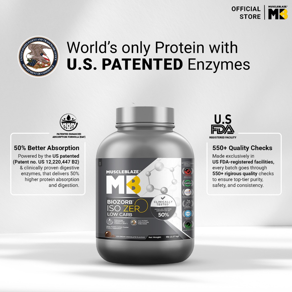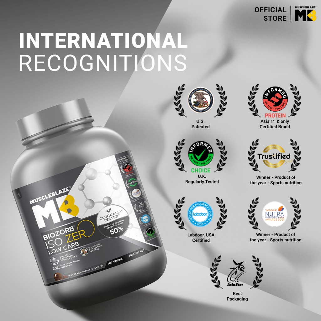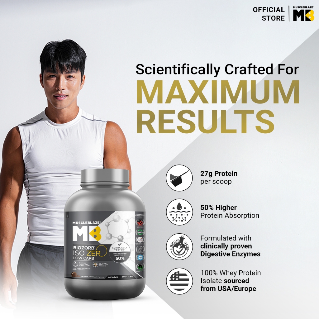 MuscleBlaze Biozorb Iso-Zero, Low Carb (Ice Cream Chocolate, 5lbs / 2.27kg) | 27g Pure Whey Protein Isolate Per Scoop