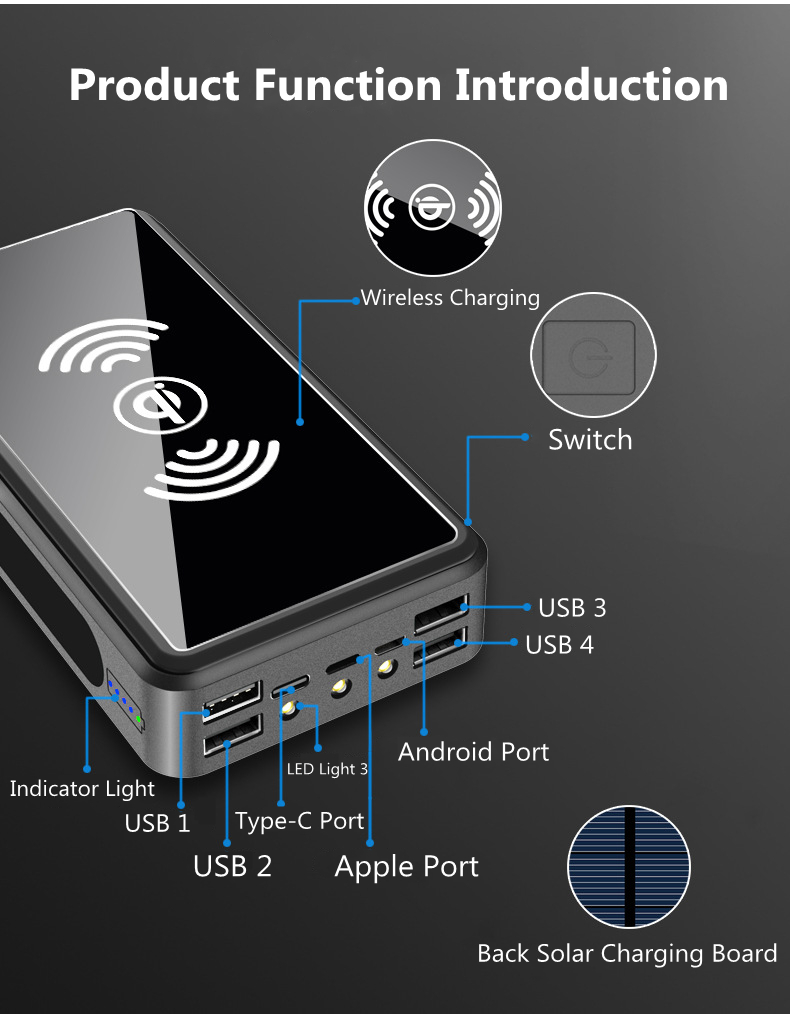 NEW100% PowerBank 100000mAh Solar Wireless 3 Input 5 Output Super Large Capacity Power Bank Portable Charger