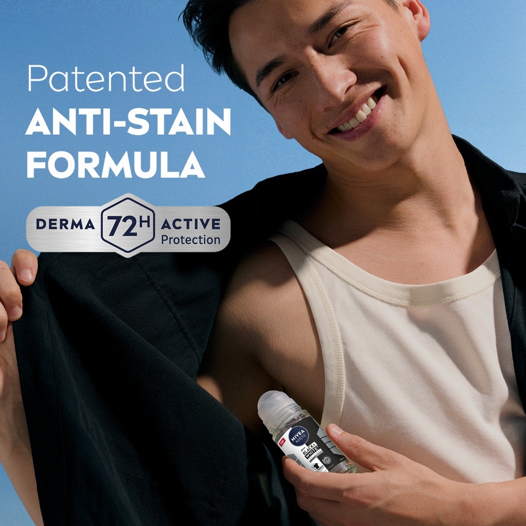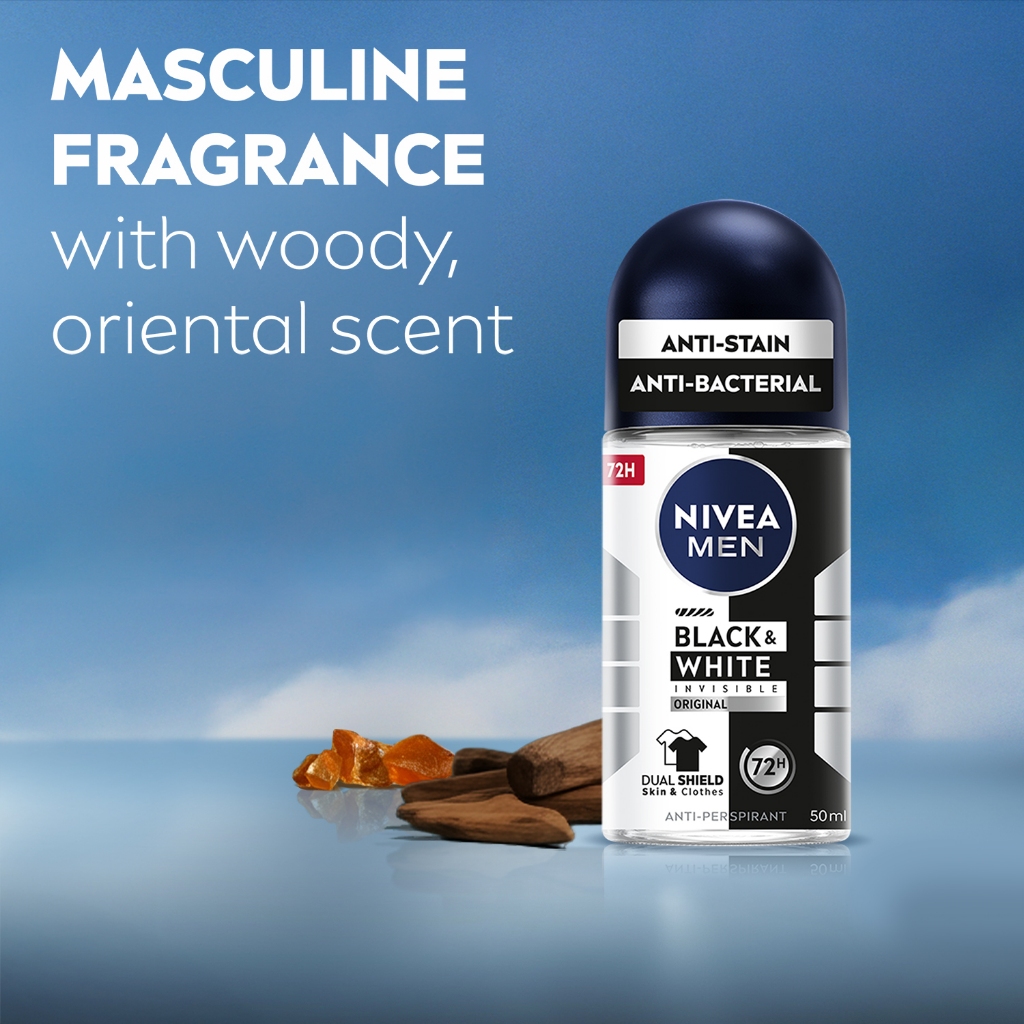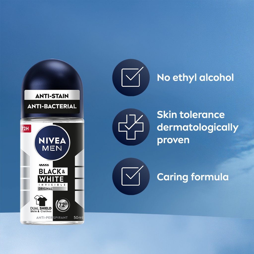 NIVEA MEN Deodorant Roll On - Black & White / No stain / No Sweat / Anti Bacterial / Perfume / 50ml / Men's