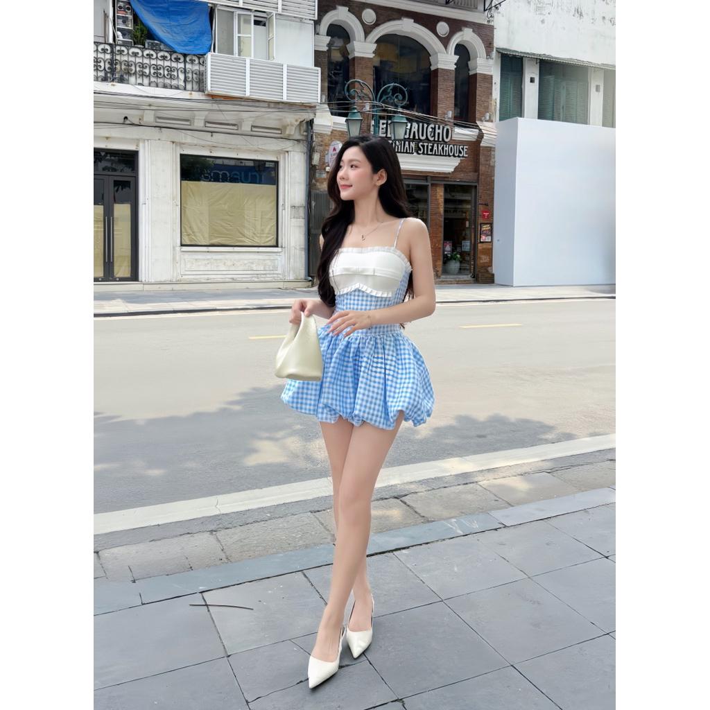 Blue Checkered Strapless Dress with White Bow_HOT TREND 2025_Shop Self-shot Photo