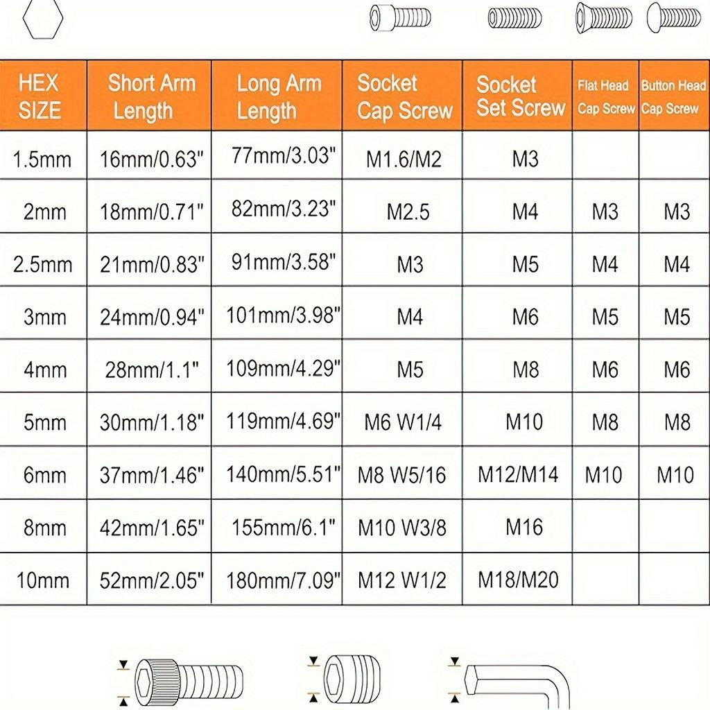 New 9-Piece L-Shaped Metric Allen Wrench Set in Chrome Vanadium Steel, Sizes 1.5-10 mm