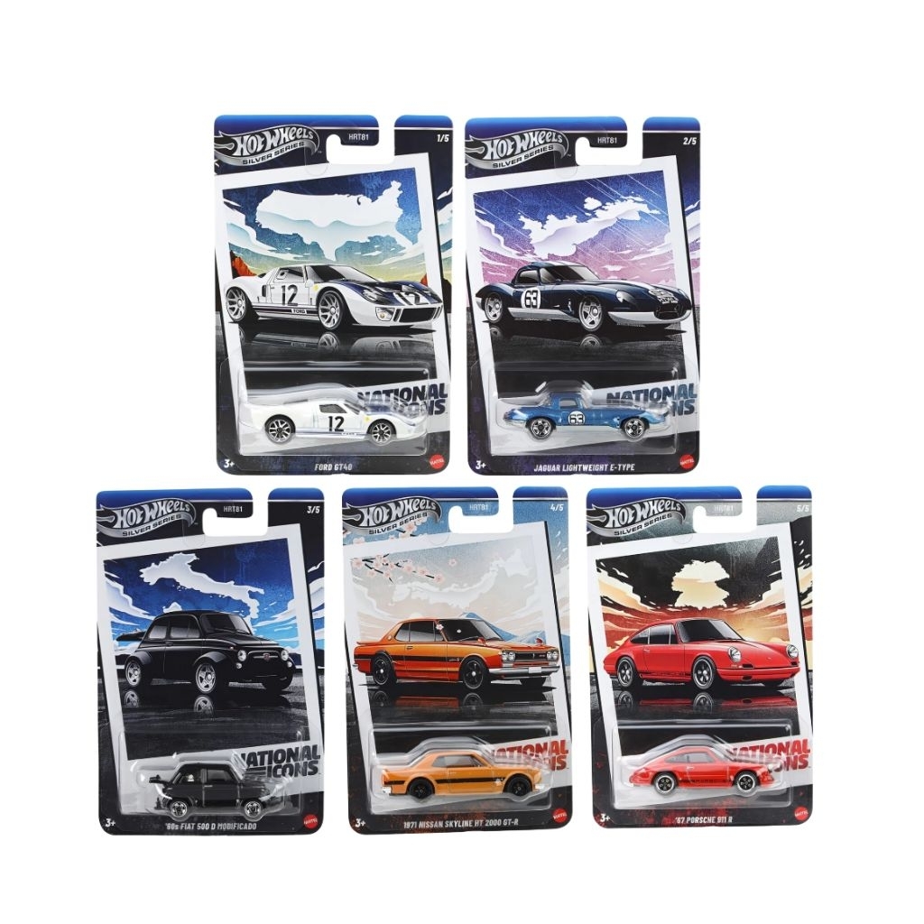 New Hot Wheels National Icons 2025 | Ford GT40, Jaguar Lightweight E-type, '60s Fiat 500 D Modificado, 1971 Nissan Skyline HT 2000 GT-R, '67 Porche 911 R, '67 Porche 911 R (Chase) | HotWheels Silver Series