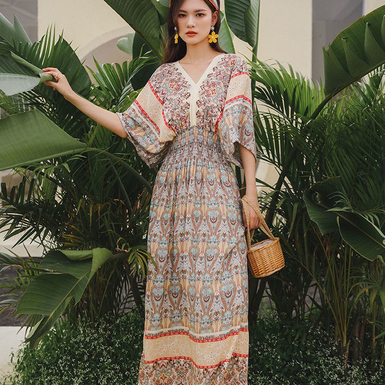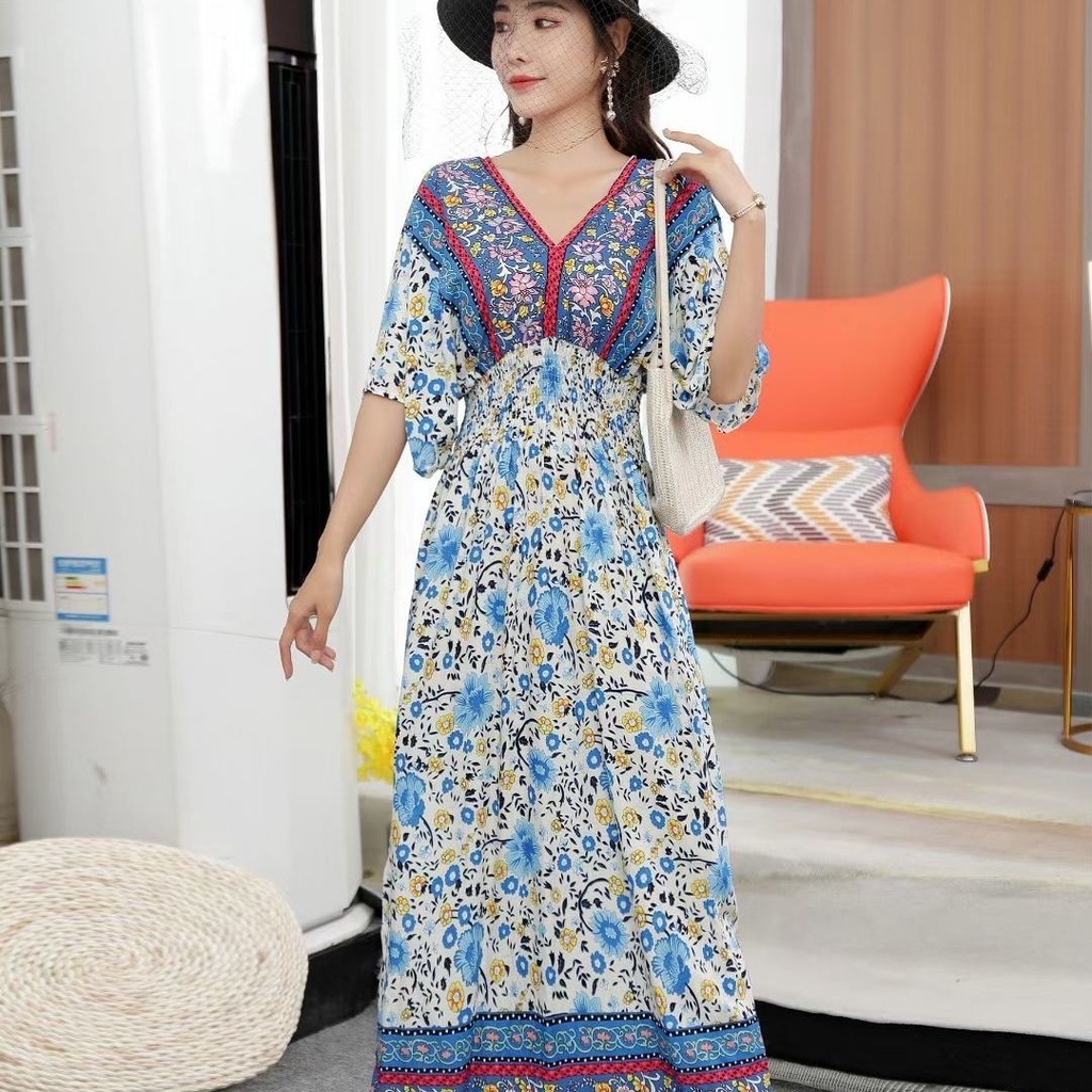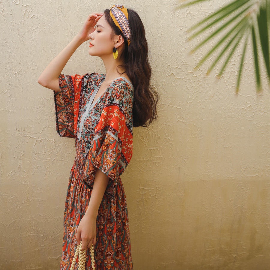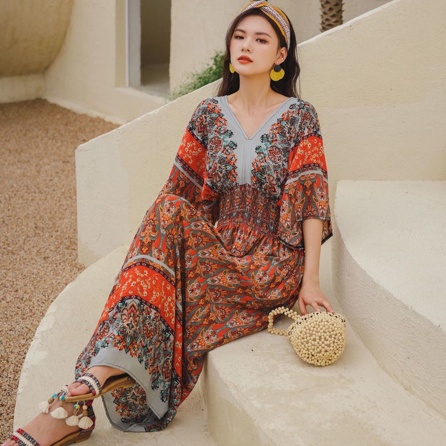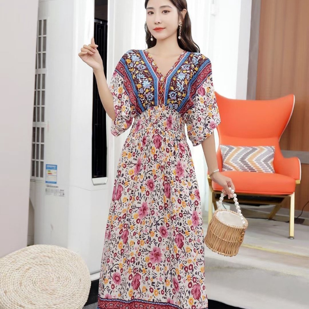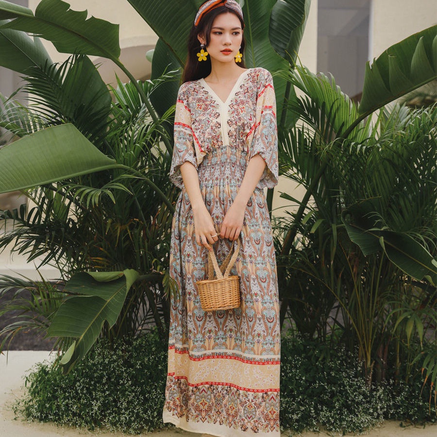 New Year Clothes 2024 cheongsam cheongsam cny dress New Year dress Indonesia dress Female Thai Bohemian Ethnic Style Retro Long dress Seaside Vacation Beach dress