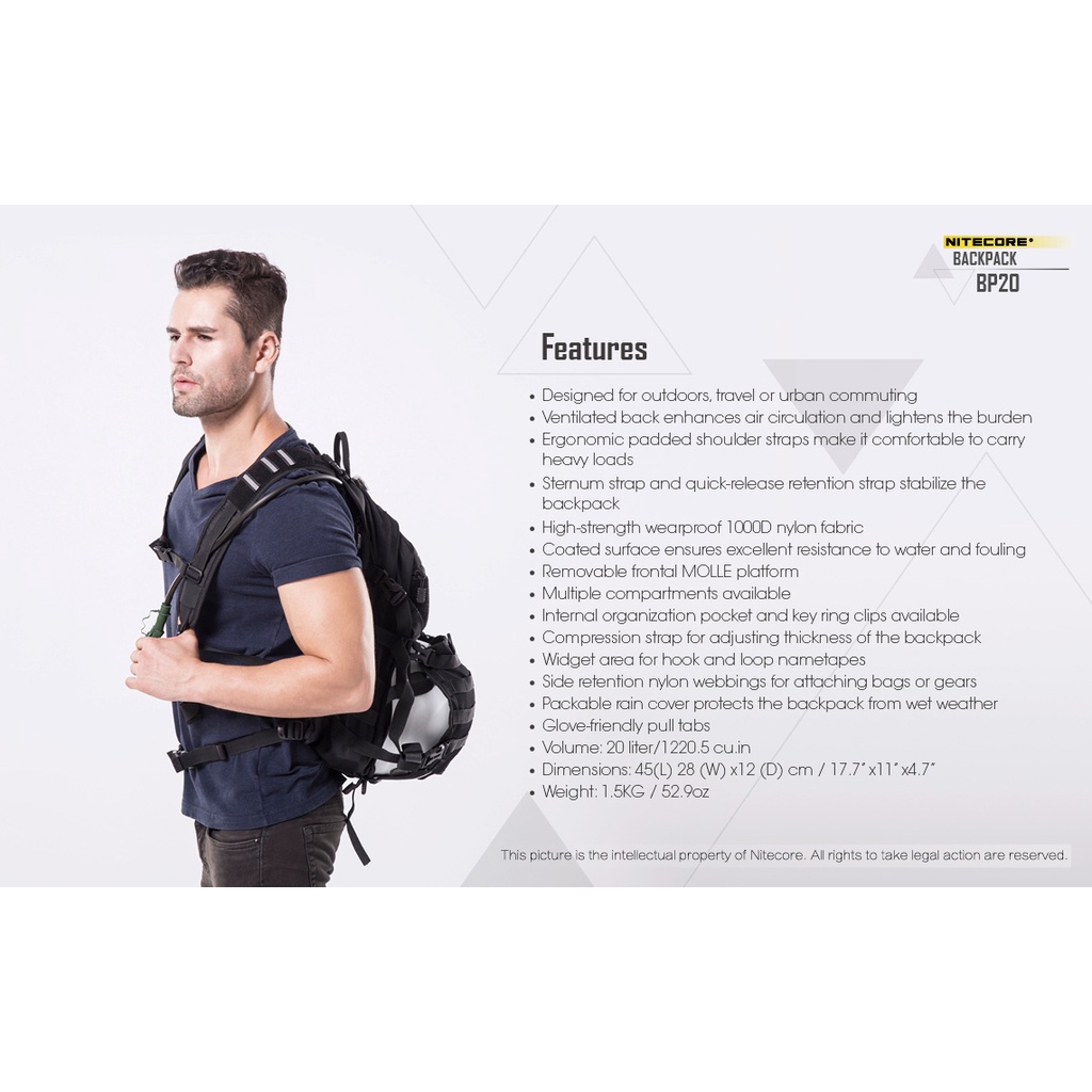 Nitecore BP20 Multi-Purpose All-Weather MOLLE Compatible Backpack with Packable Rain Cover