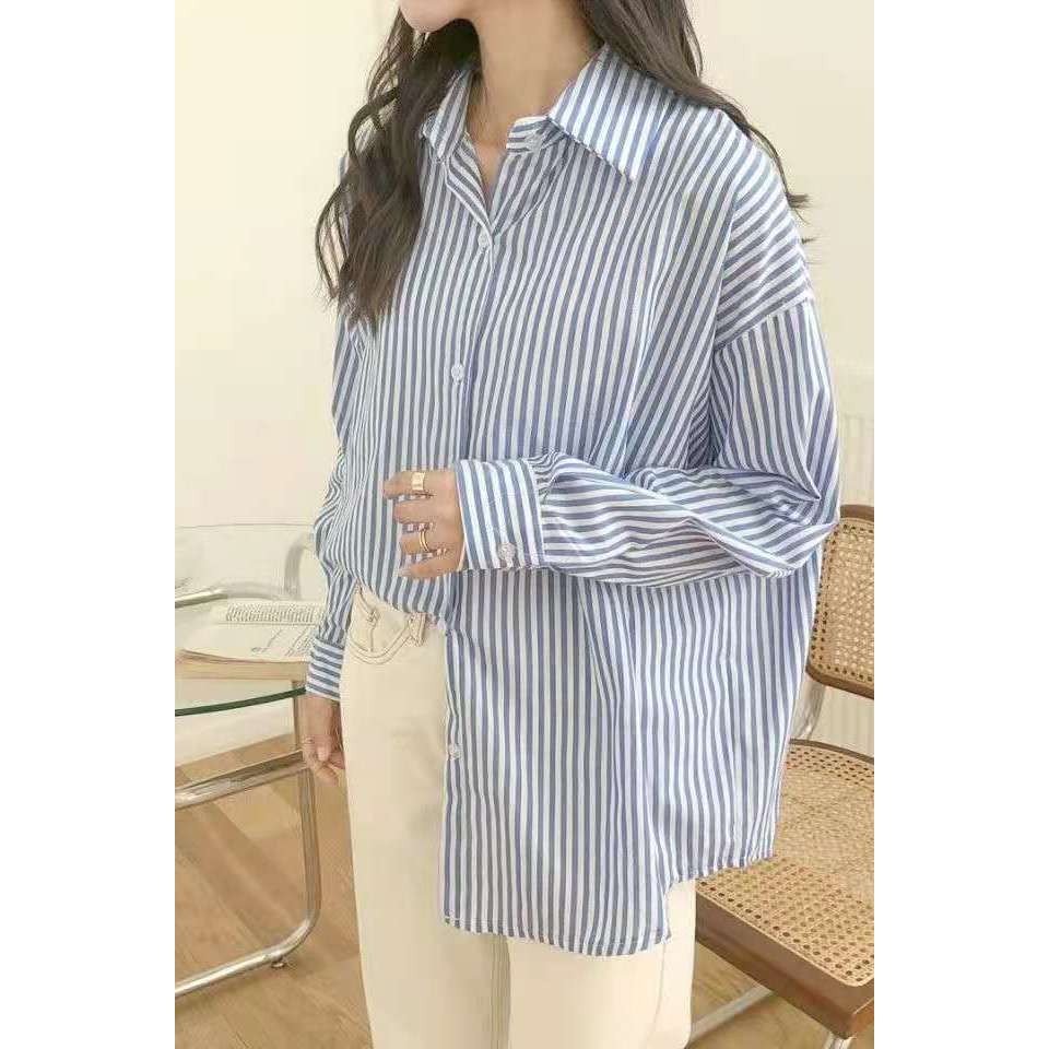 Vertical Striped Shirt Blouse Blue Stripes Long Sleeve Shirt Women