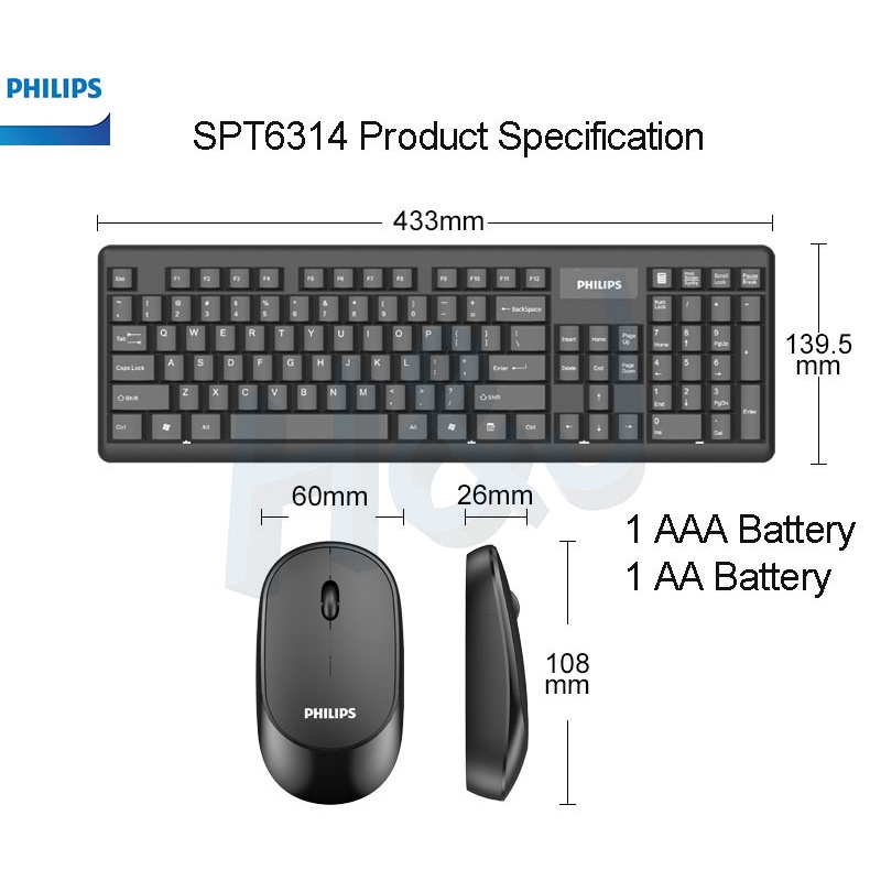 PHILIPS Wireless Slient Keyboard And Mouse Combo Set with Battery Play Ergonomic Design Model SPT6314 2.4G Wireless Mous