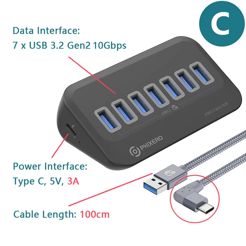 PHIXERO USB 3.2 Docking Station Hub 4 Ports 7 Ports PD60W 10Gbps Splitter Switch Dock Multi Port SD Card Socket Type C Gen2 for Surface PC Laptop 3.0