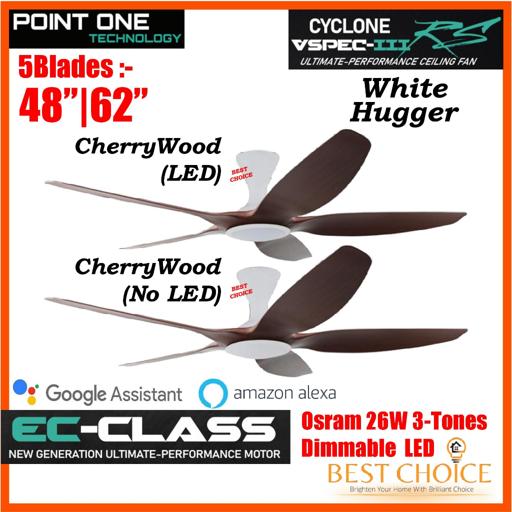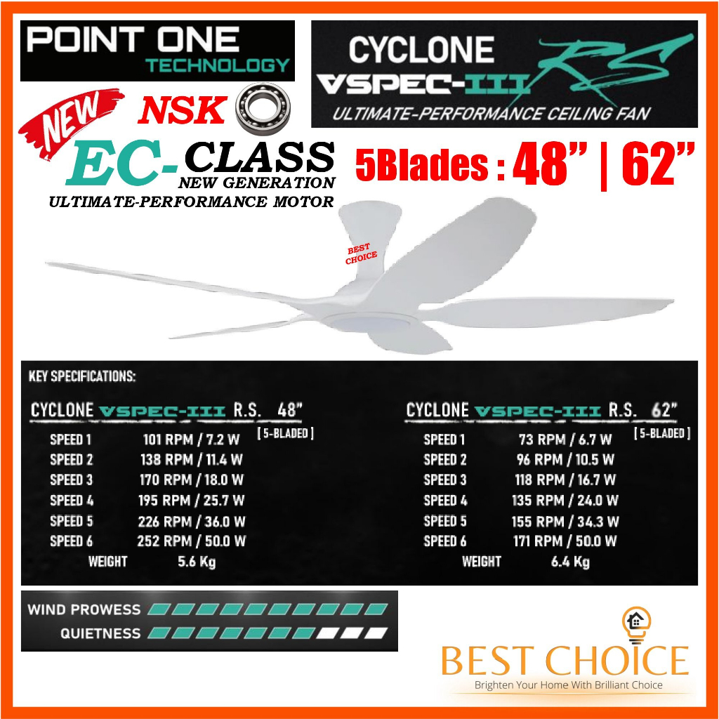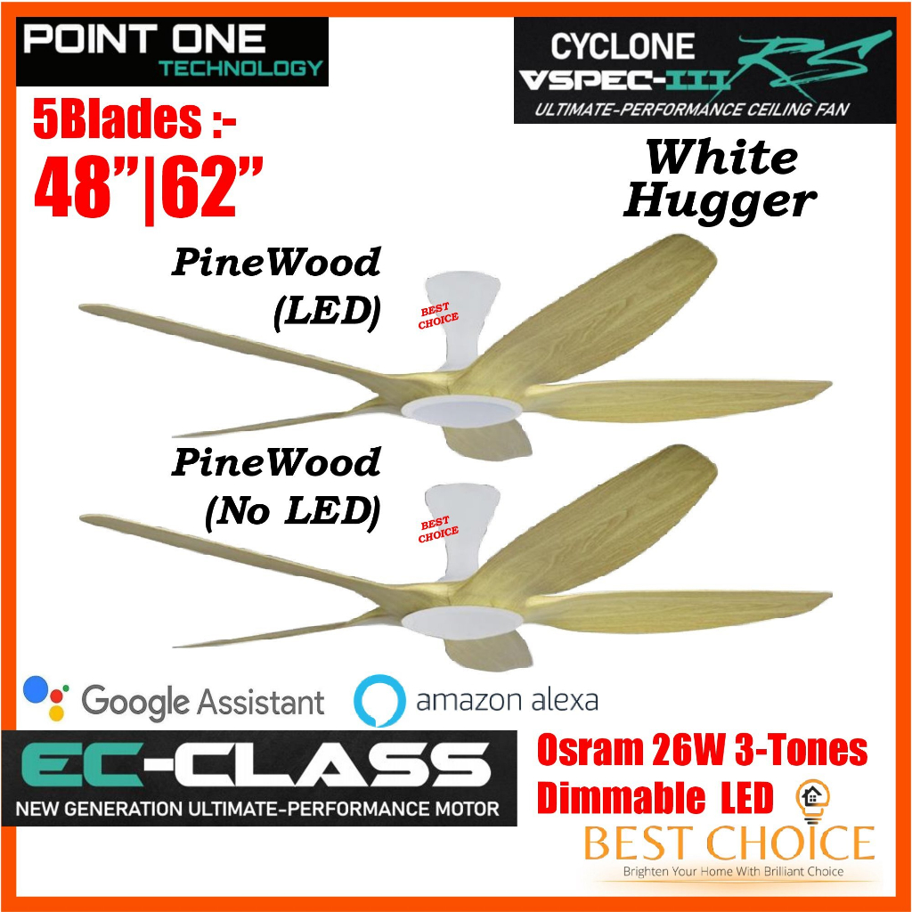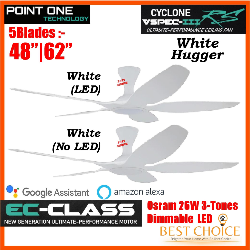 PO ECO CYCLONE VSPEC-III RS 5Blades White Body SMART WIFI EC Motor Ceiling FAN 48/62in Dimmable 3-Tones LED Light