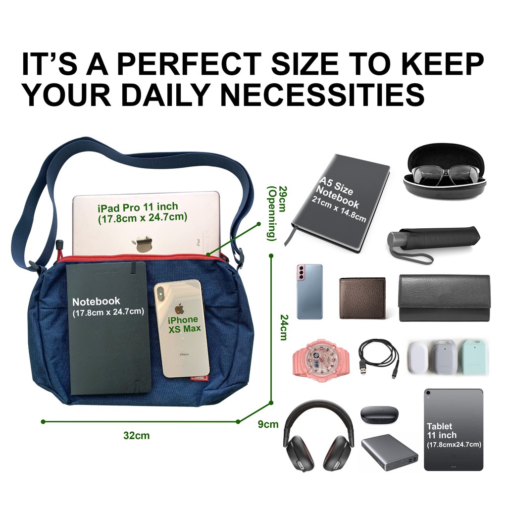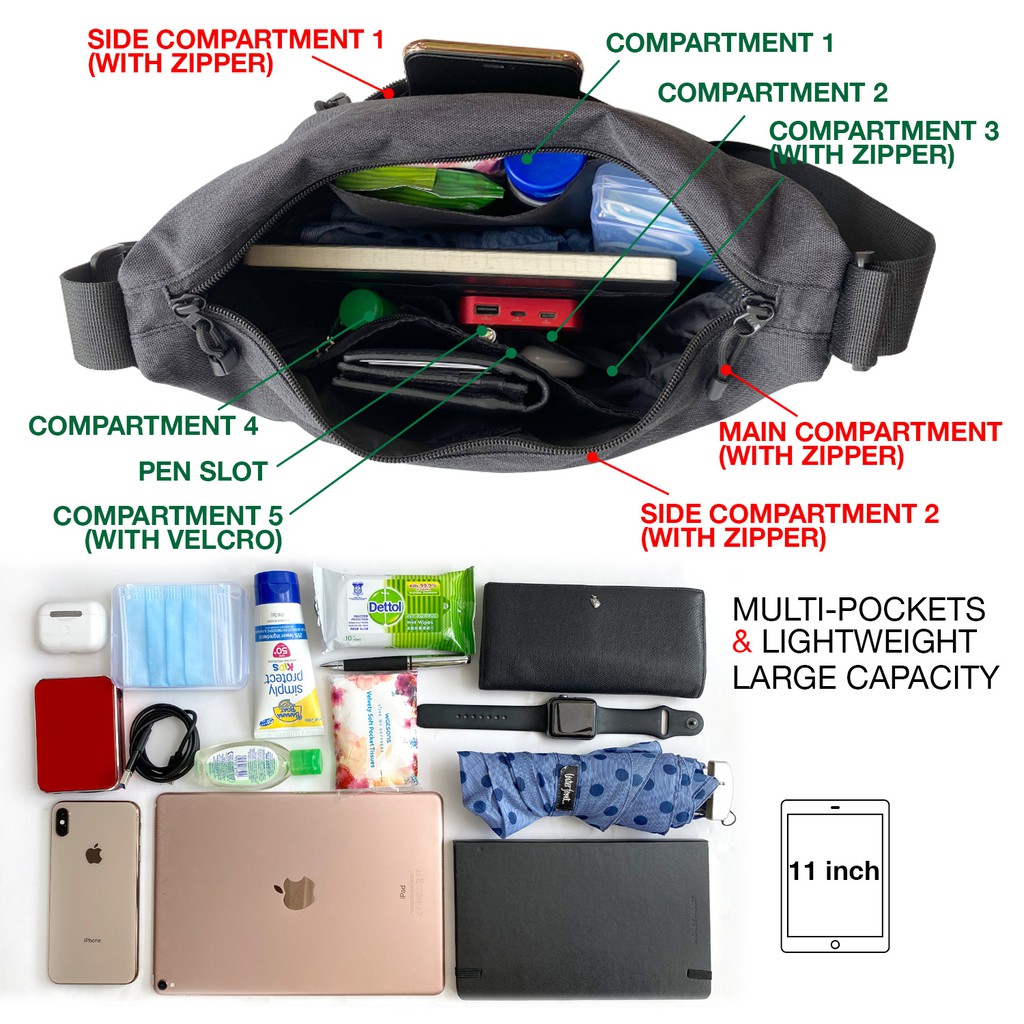 PUNKSTAR Waterproof Lightweight Multi Pockets Sling Messenger Cross Body Bag Fit 11 inch Tablet YKK Zip for Men Woman