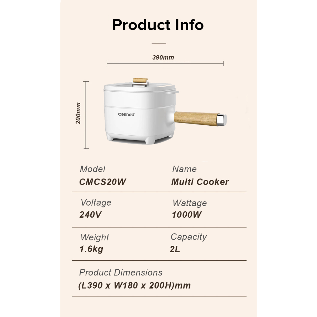 Cornell 2.0L Multi Cooker with Food Tray, Detachable Power Cord