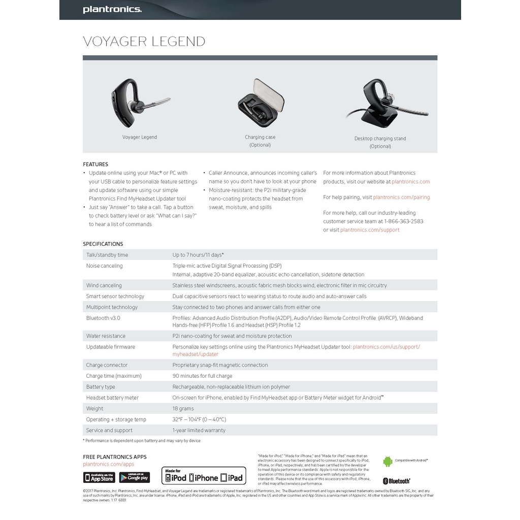 Plantronics - Voyager Legend (Poly) - Bluetooth Single-Ear (Monaural) Headset - Connect to Your PC, Mac, Tablet