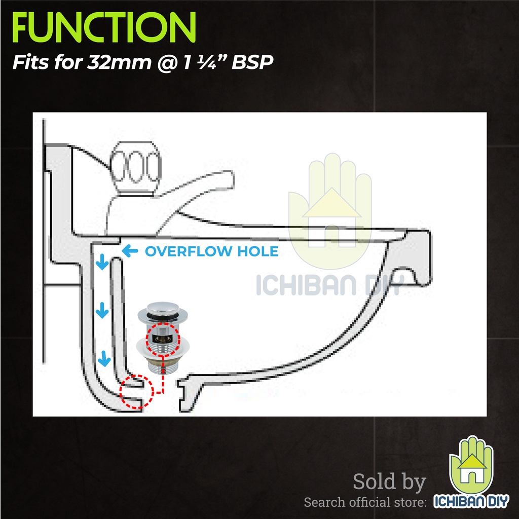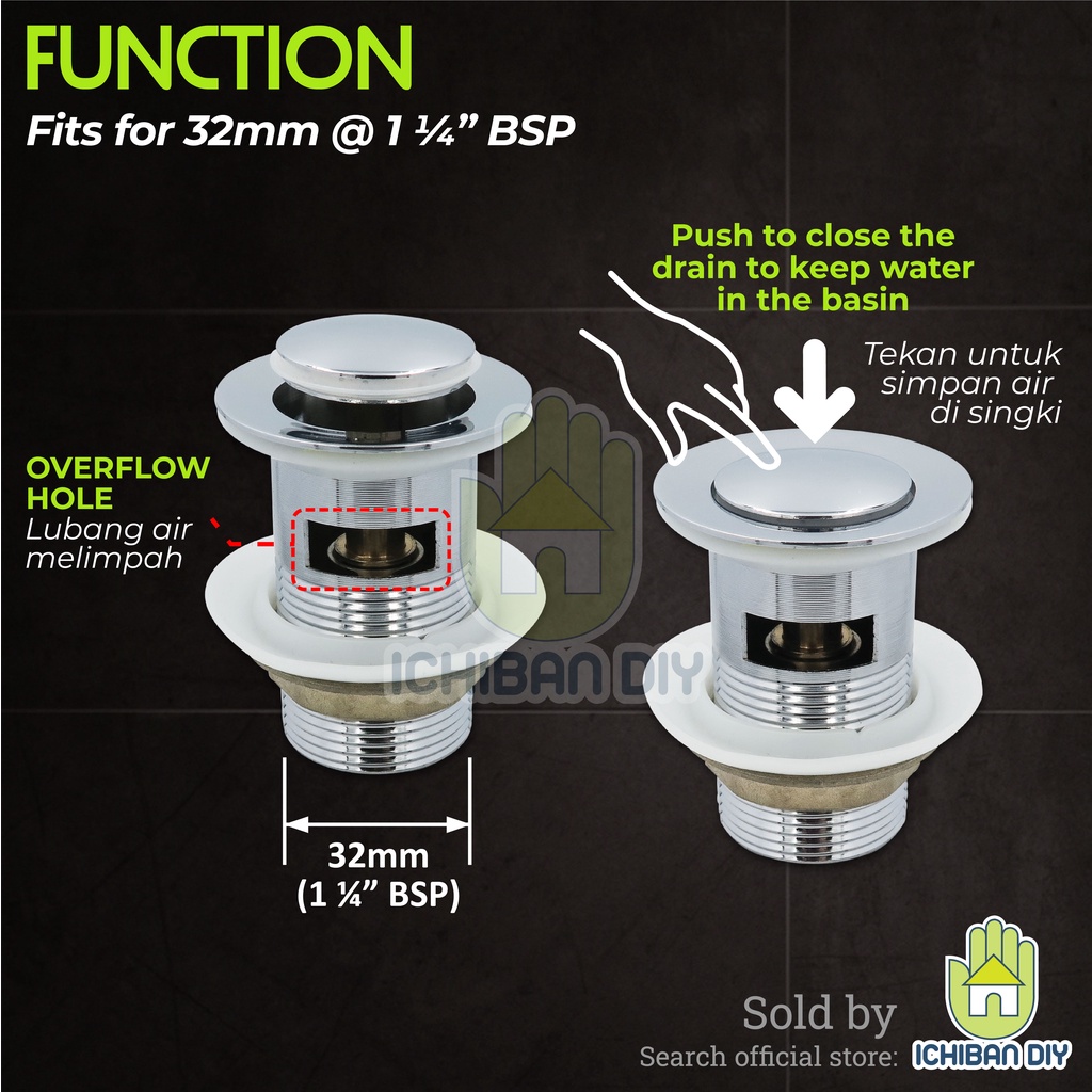 Pop-up Waste with Overflow 32mm Hole Pop Up Wash Basin Drain Push Button Bathroom Sink Penutup Lubang Singki Bilik Air