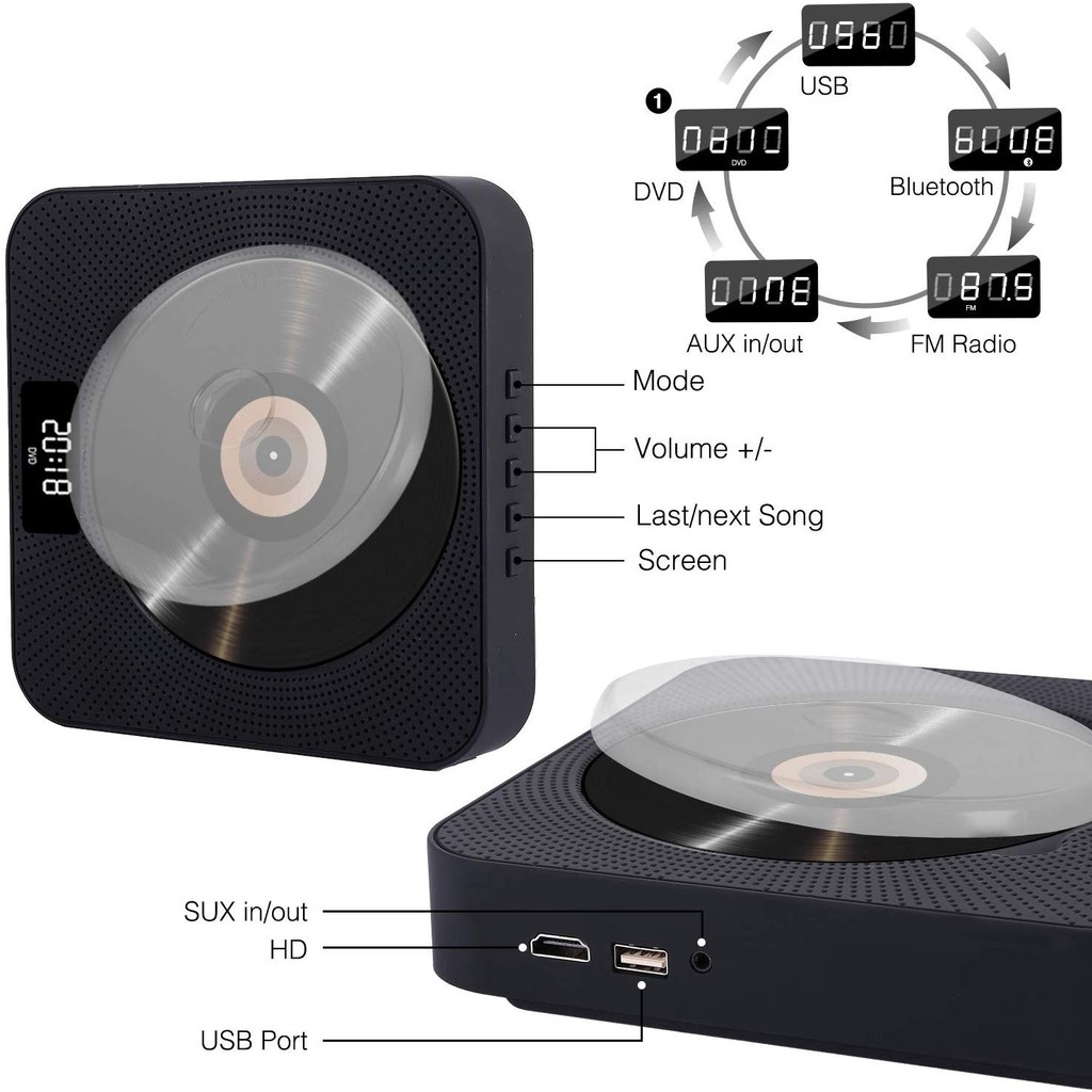 Portable Bluetooth DVD / CD Player, Wall-Mounted DVDs Player, Dual Pull Switch, Music Player Support HiFi Speakers1080P HDMI Output with Remote for TVMusic Player FM Radio USB AV