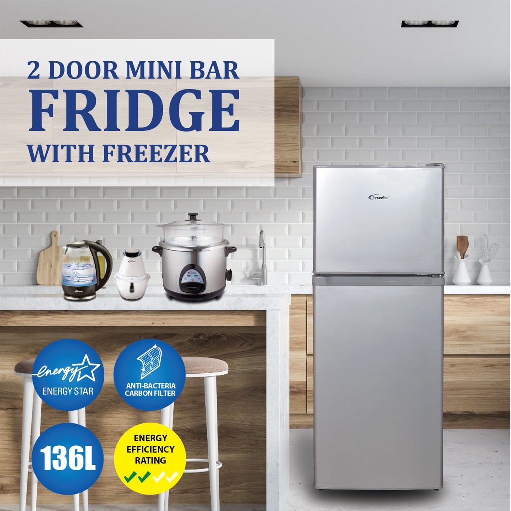 PowerPac 135L 2 Door Mini Fridge + Freezer, shelves, crisper, anti-bac Filter, optimal door seal, temp < -18°C (PPF136)