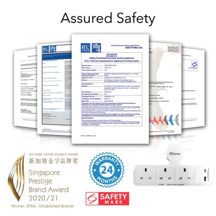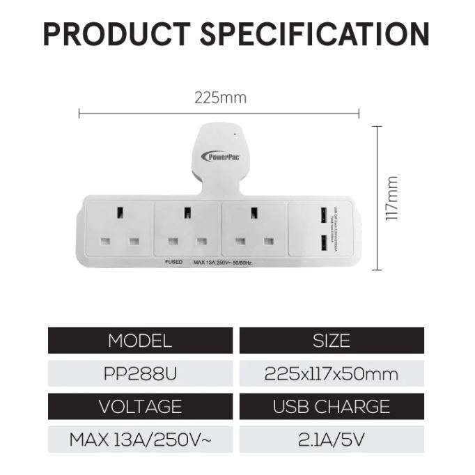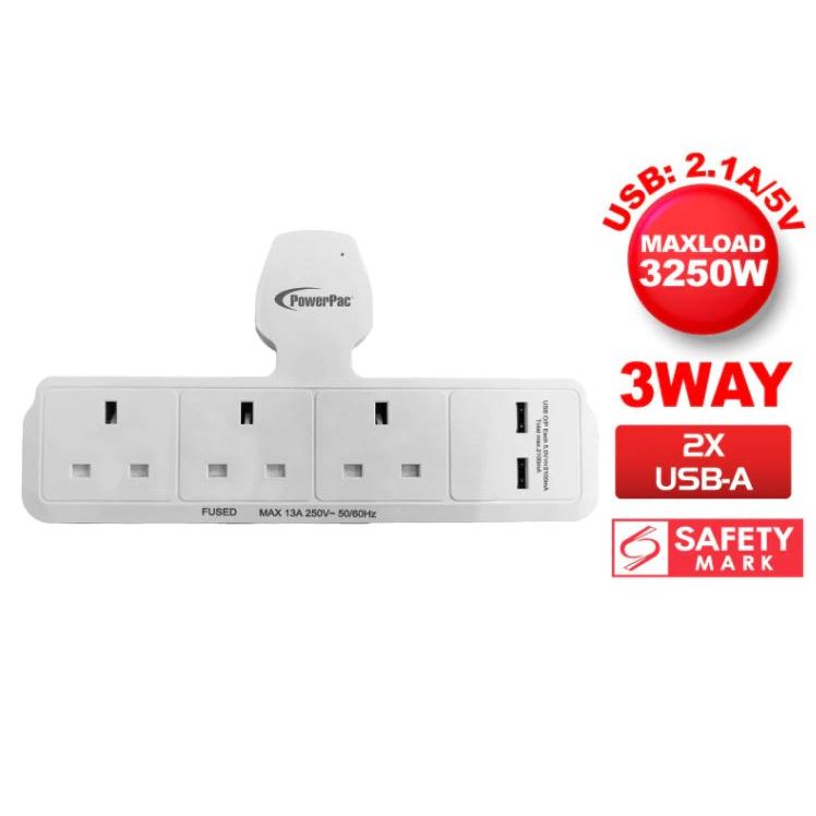 PowerPac 3 Way Extension Plug Adapter with USB/Type C | Extension Wall Socket