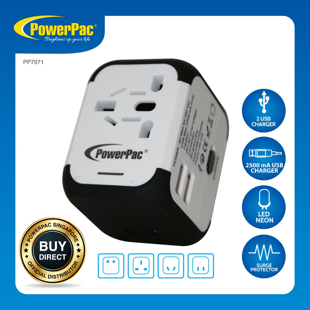 PowerPac Multi Travel Adapter With 2 USB Charger, US UK EU AU Adapter (PP7971)