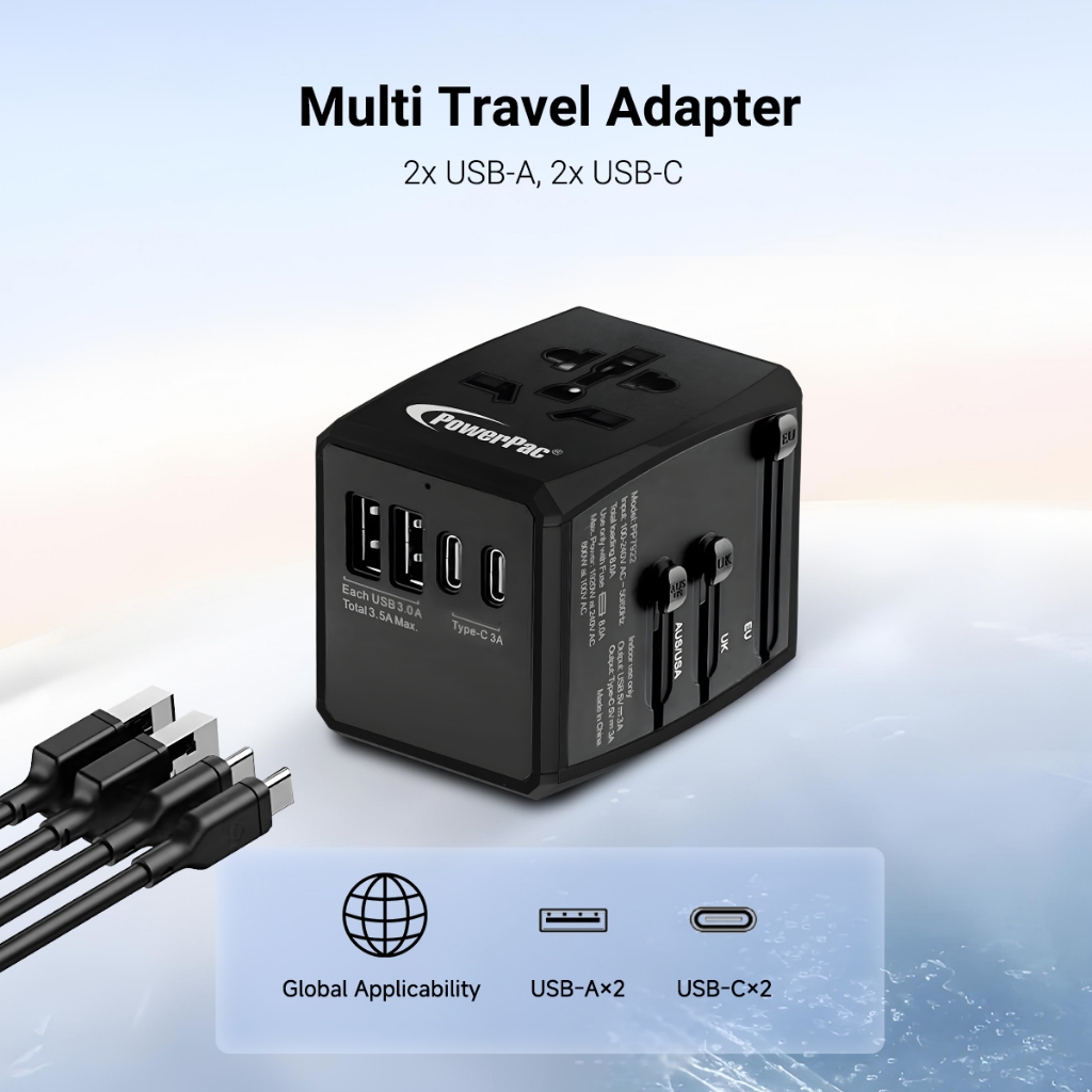PowerPac Multi Travel Adapter With 2x USB-A + 2x USB-C Charger | PD 15W USB Charger (PP7922)