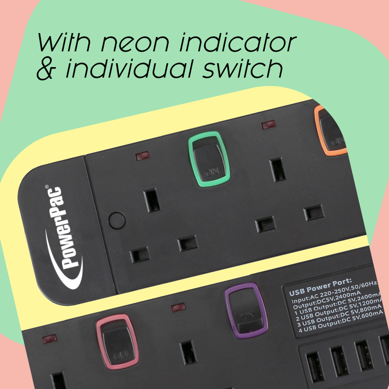 PowerPac Power Extension Socket Extension Cord, Power Cord 3/4/5/6 way 3 meter with 4x USB Charger (PP9113UBK-PP9116UBK)
