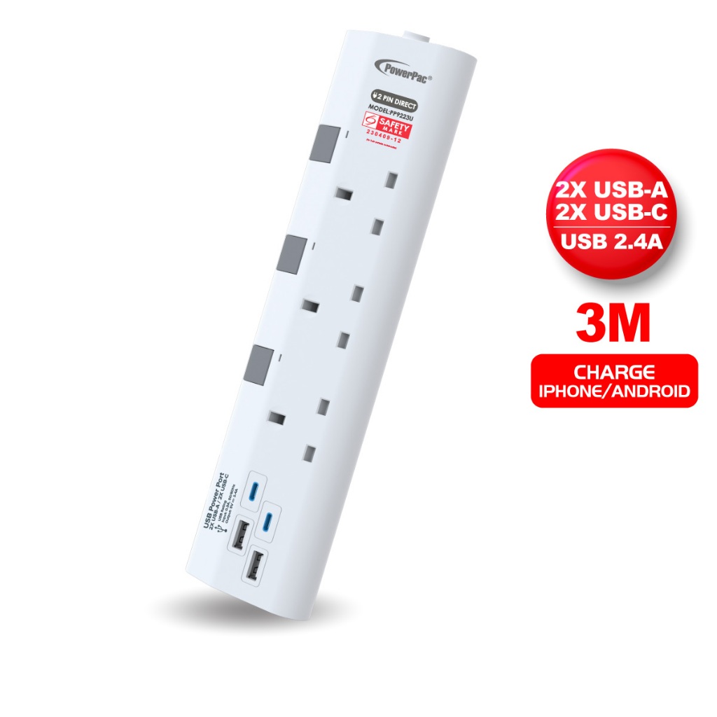 PowerPac Power Extension Socket Extension Cord, Power Cord 3/4 way 3 meter with 2xUSB-A&2xUSB-C Charger(PP9223U-PP9225U)