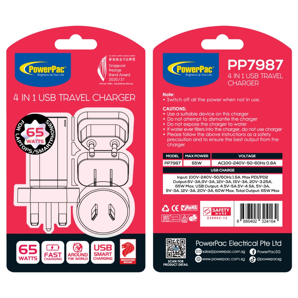 PowerPac USB Travel Adapter 3 Pin Plug, Fast Charge, Smart Charge 65 Watts, Tablet Charger, Smart Phone Charger (PP7987)