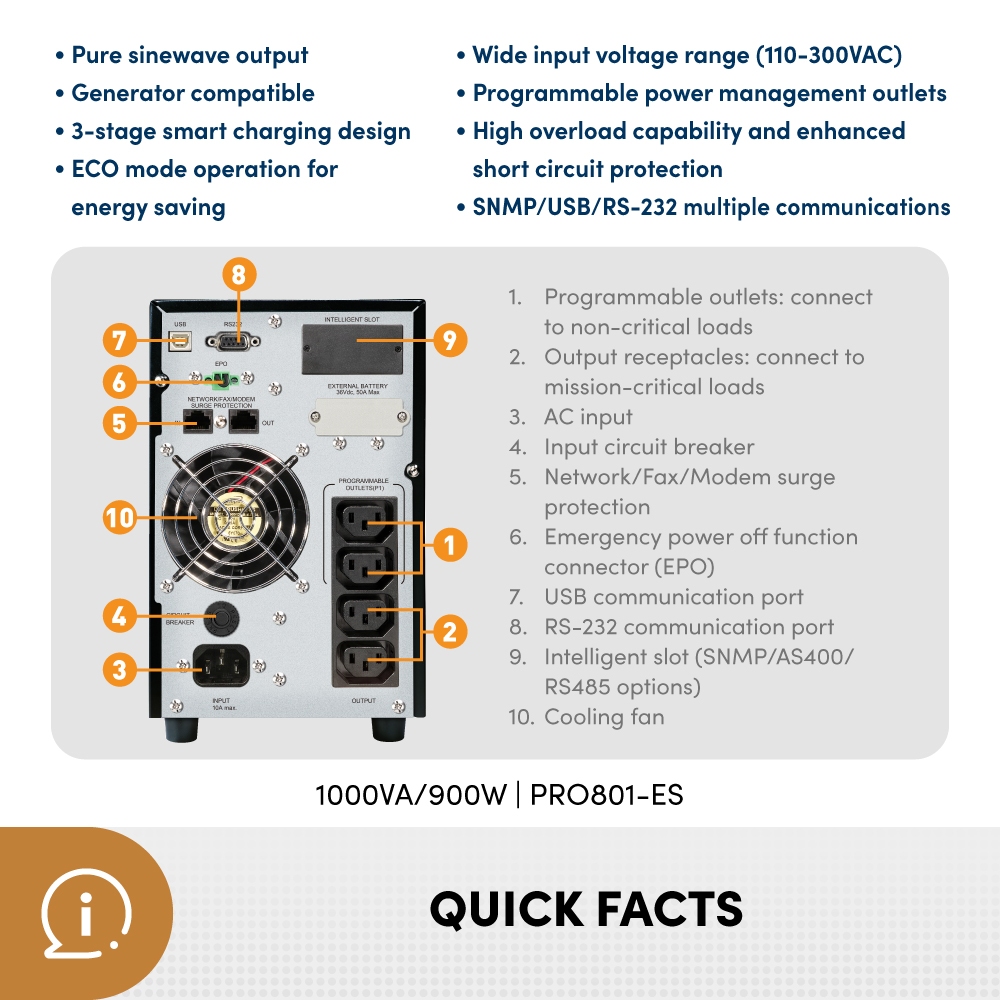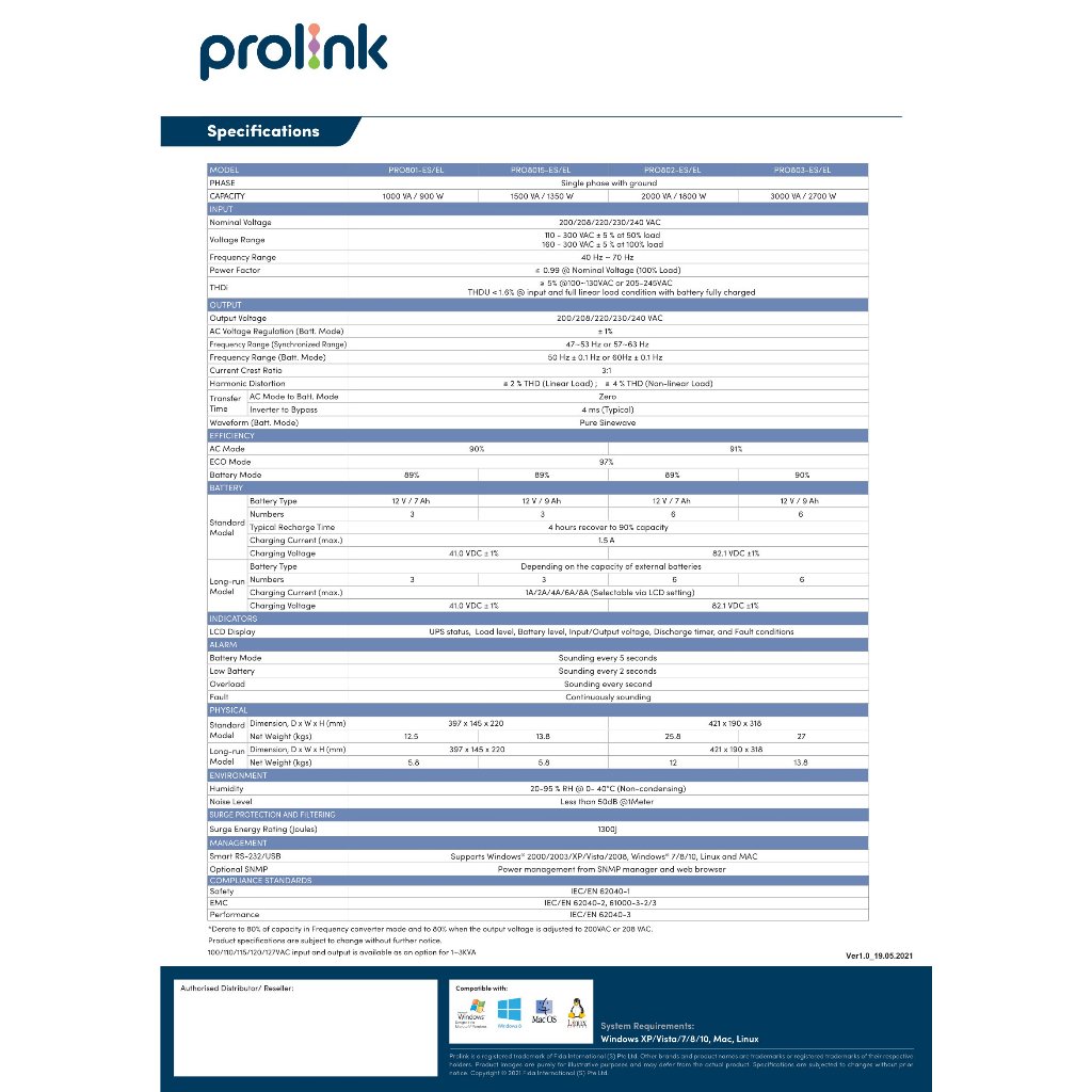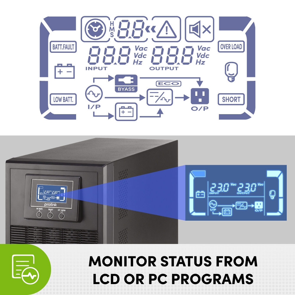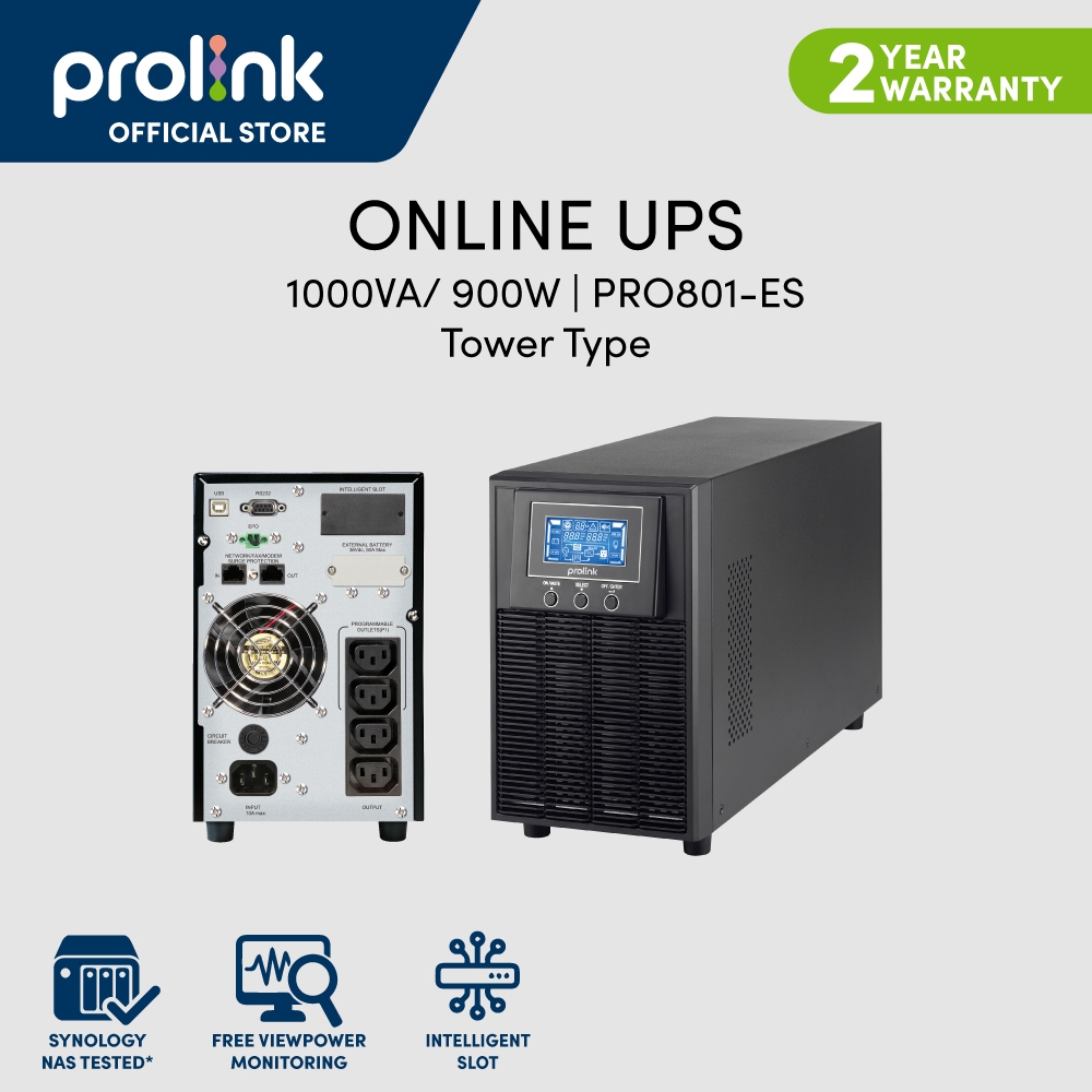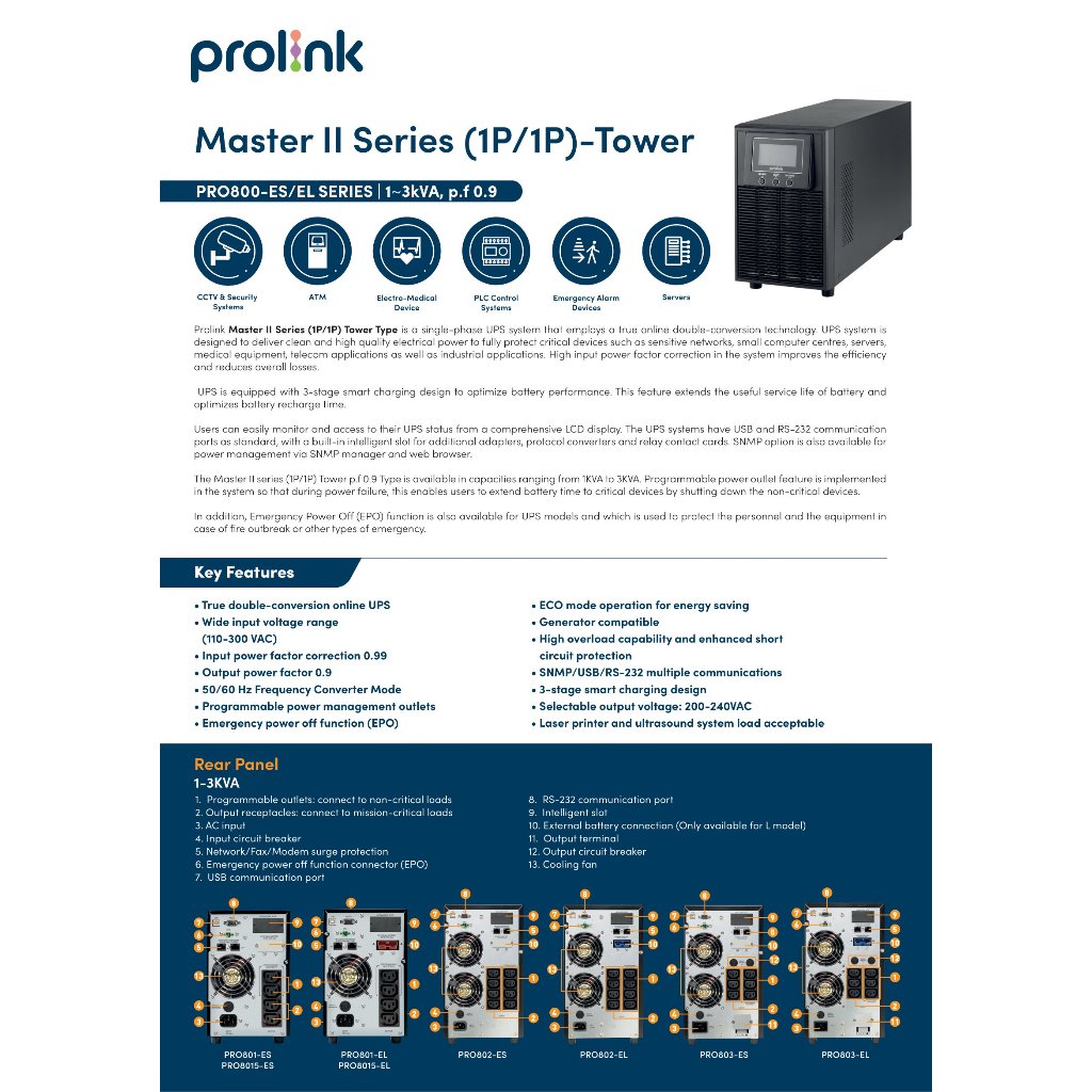 Prolink 1KVA 2KVA 3KVA , p.f 0.9 , Master II Series (1P/1P) Smart Online UPS Tower (PRO801-ES PRO802-ES PRO803-ES)