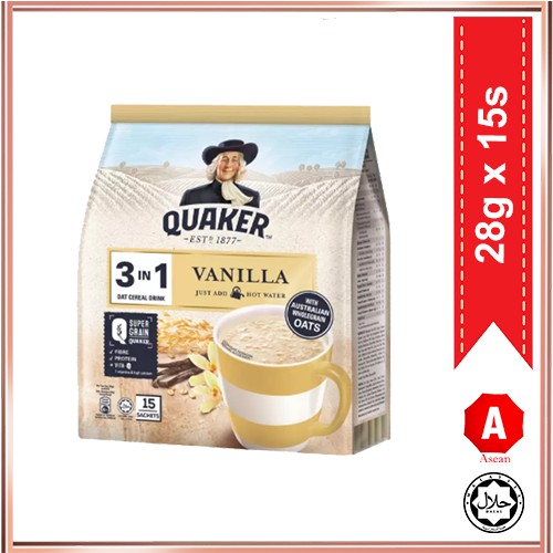 QUAKER 3 IN 1 INSTANT OATS CEREAL DRINK VANILLA WITH WHOLEGRAIN OATS HEALTHY DRINKS 15 SACHETS X 28G (420G) ASEAN.OS