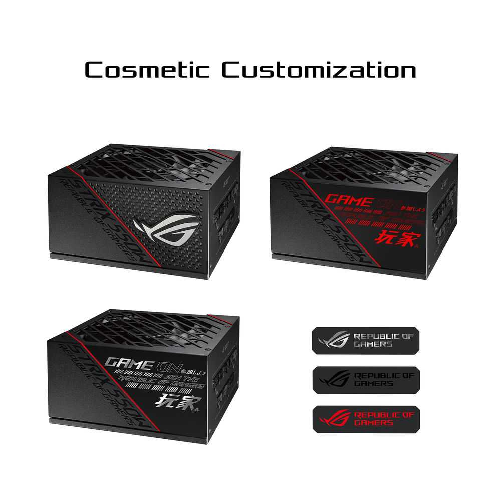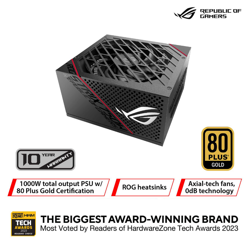 ROG Strix 1000W Gold PSU, Power Supply ROG heatsinks, Axial-tech fan design, dual ball fan bearings, 0dB technology
