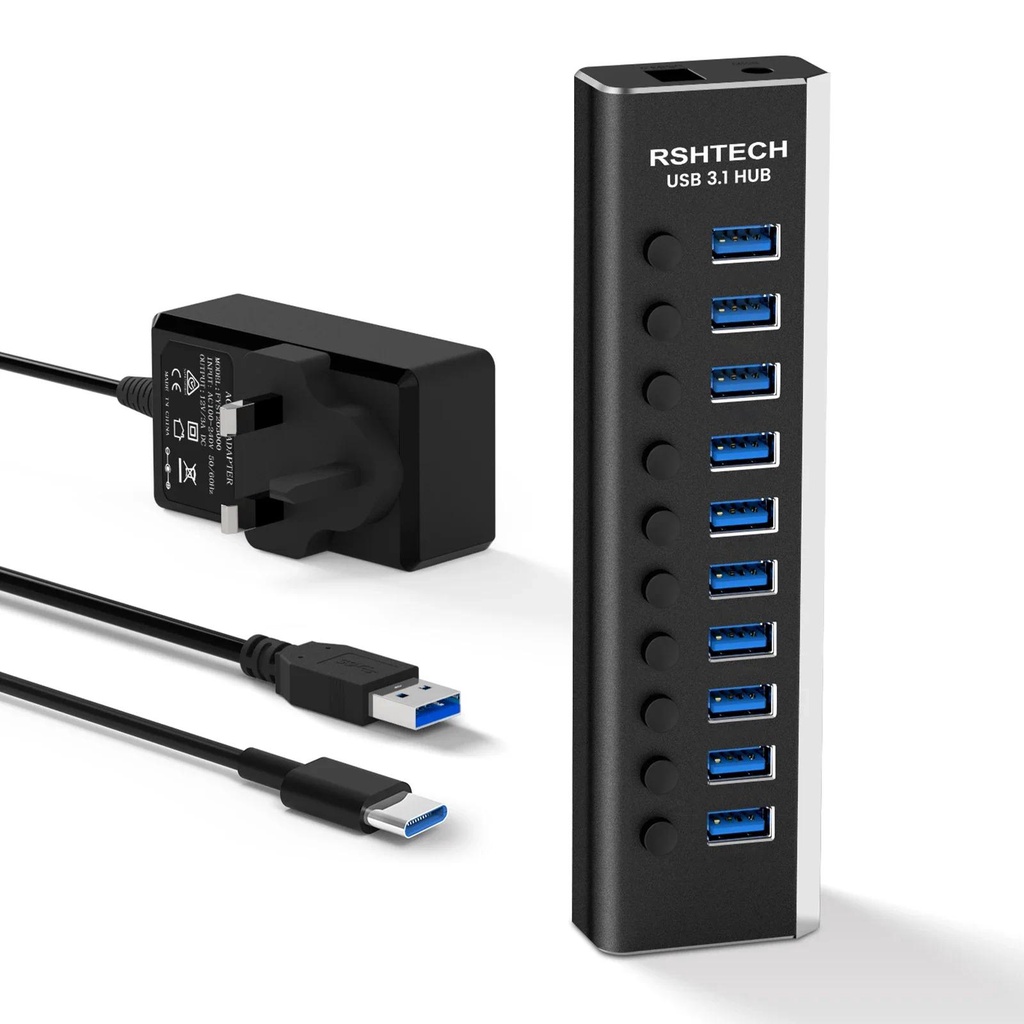 RSHTECH A10S USB Hub 10 Port USB 3.1/3.2 Gen 2 Hub 10Gbps 36W 12V/3A Power Adapter Aluminum USB C Hubs Splitter for PC Laptop
